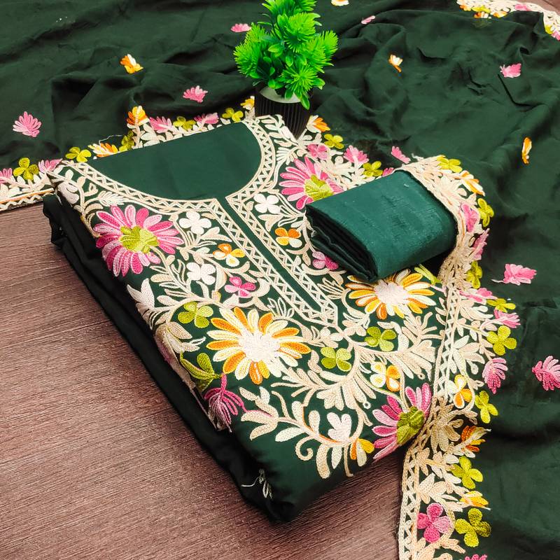 Women's green embroidery silk dress material unstitched