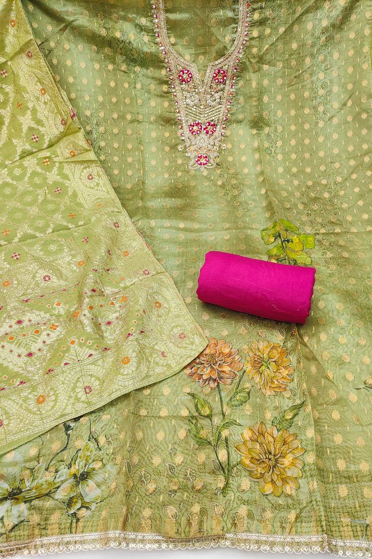 | Product Description | Women's Light Green Unstitched Woven Digital Emblishment Handwork Organja Banarasi Dress Material Having Magenta Color Unstitched Bottom Of Rayon Fabric And Light Green Color Dupatta Of Banarasi Jacquard Material With Beautifull Light Green Colour In Organja Banarasi Jacquard Rayon Fabric With Work Of Heavy Woven Digital Emblishment Handwork And Fancy Border With Designer Weaving Dupatta|| Images Are For The Referance Purpose Only, Color Of The Actual Product May Little Vary From The Image Due To Screen Resolution |