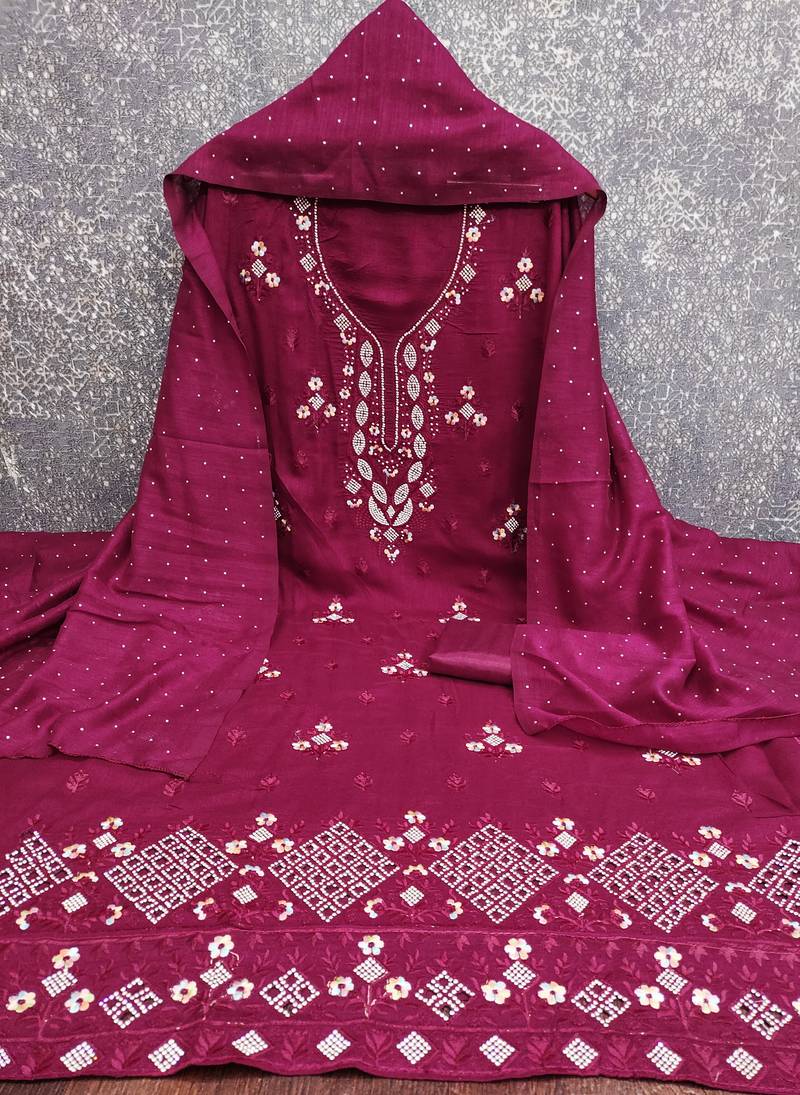 Women's magenta embroidery vichitra cotton dress material unstitched