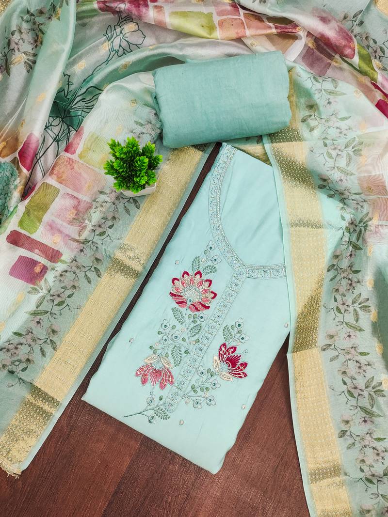 | Product Description | Add A Touch Of Sophistication With This Mint Green Unstitched Salwar Kameez Dress Material Crafted From Premium P V Cotton Silk. The Top Features Intricate Heavy Embroidery Paired With A Fancy Designer Border, Creating A Festive And Elegant Appeal. It Comes With A Comfortable Mint Green Unstitched Rayon Bottom, Allowing You To Tailor The Outfit To Your Preferred Style. The Set Is Completed With A Soft Organza Dupatta In The Same Refreshing Mint Shade, Enhanced With Designer Printed Woven Patterns For Added Charm. Perfect For Weddings, Festivals, And Special Occasions, This Unstitched Suit Blends Traditional Craftsmanship With Modern Elegance. |