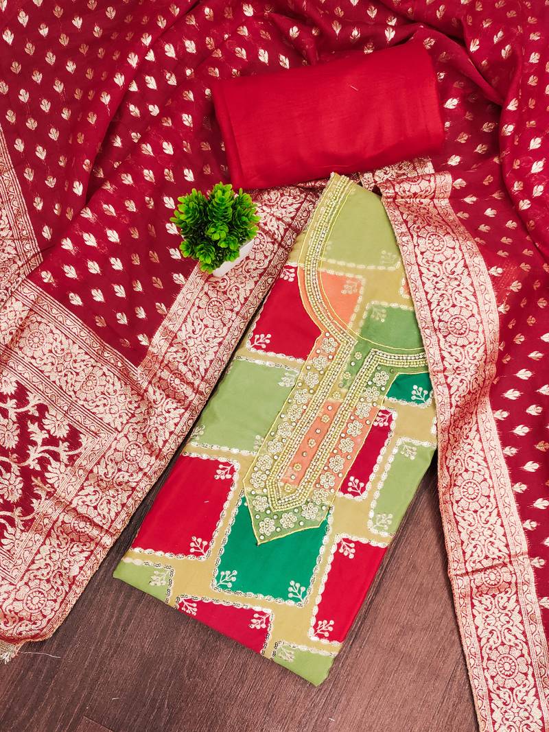| Product Name | Red Cotton Silk Unstitched Handwork Dress Material | |