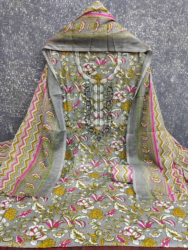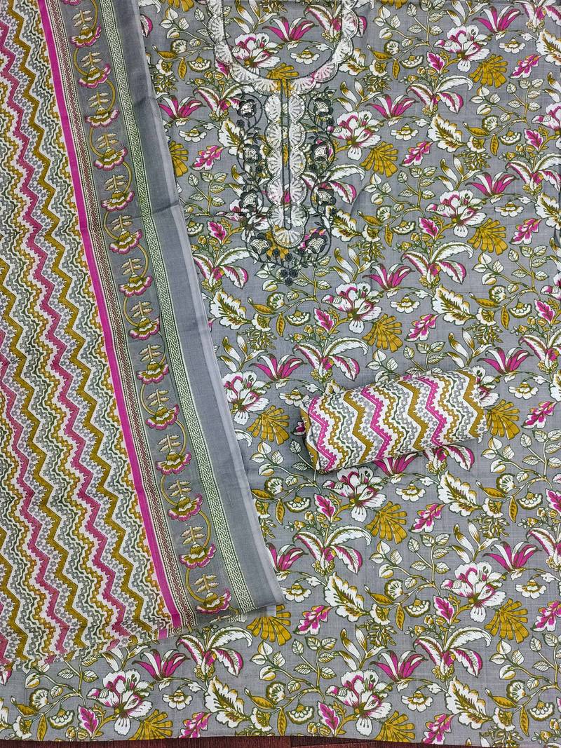 Grey multicolor printed cotton dress material unstitched