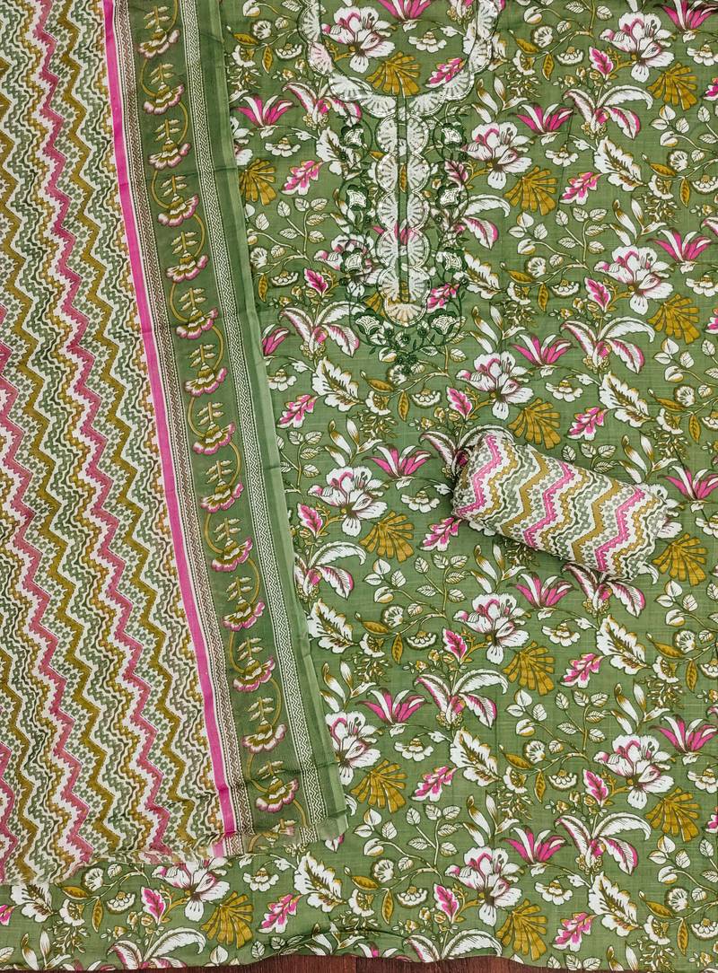 Refresh Your Ethnic Wardrobe With This Green Multicolor Printed Cotton Unstitched Dress Material, Designed For Comfort And Everyday Elegance. The Set Features A Beautifully Printed Cotton Kurta Fabric Enhanced With A Stylish Fancy Neck Design That Adds A Refined Touch To The Overall Look.