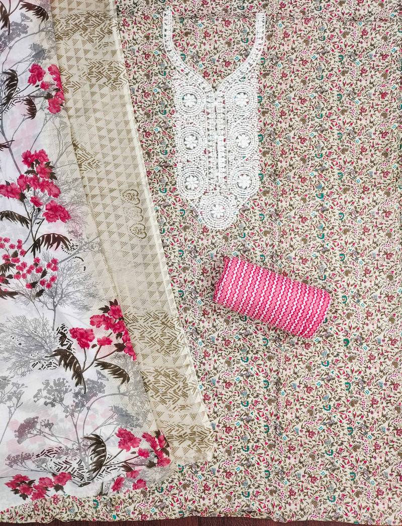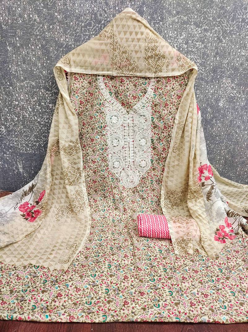 | Product Description | Women’s Multicolour Printed Unstitched Dress Material Crafted In Comfortable Cotton Fabric. This Set Features A Beautifully Detailed Fancy Embroidered Neck Panel, Paired With A Matching Printed Dupatta And A Pink Cotton Pant Fabric. Ideal For Stitching Into A Stylish Salwar Kameez, This Cotton Dress Material Is Suitable For Everyday Ethnic Wear As Well As Light Festive Occasions. |