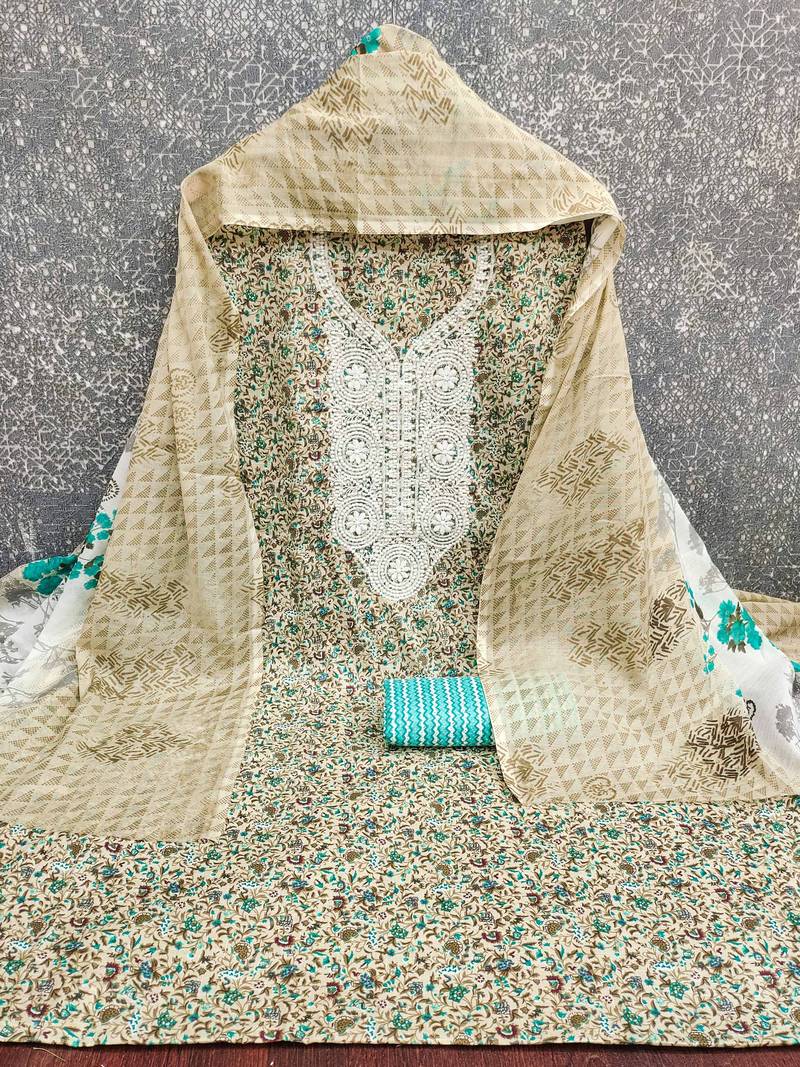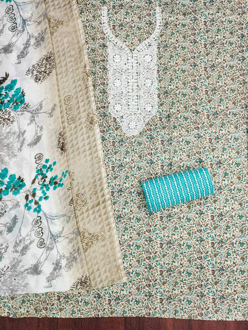 Multicolor cotton printed unstitched dress material with fancy neck work