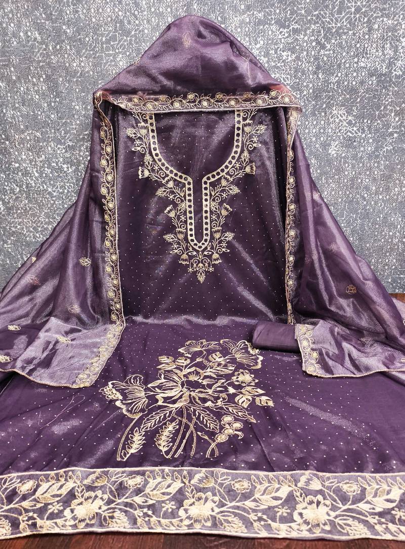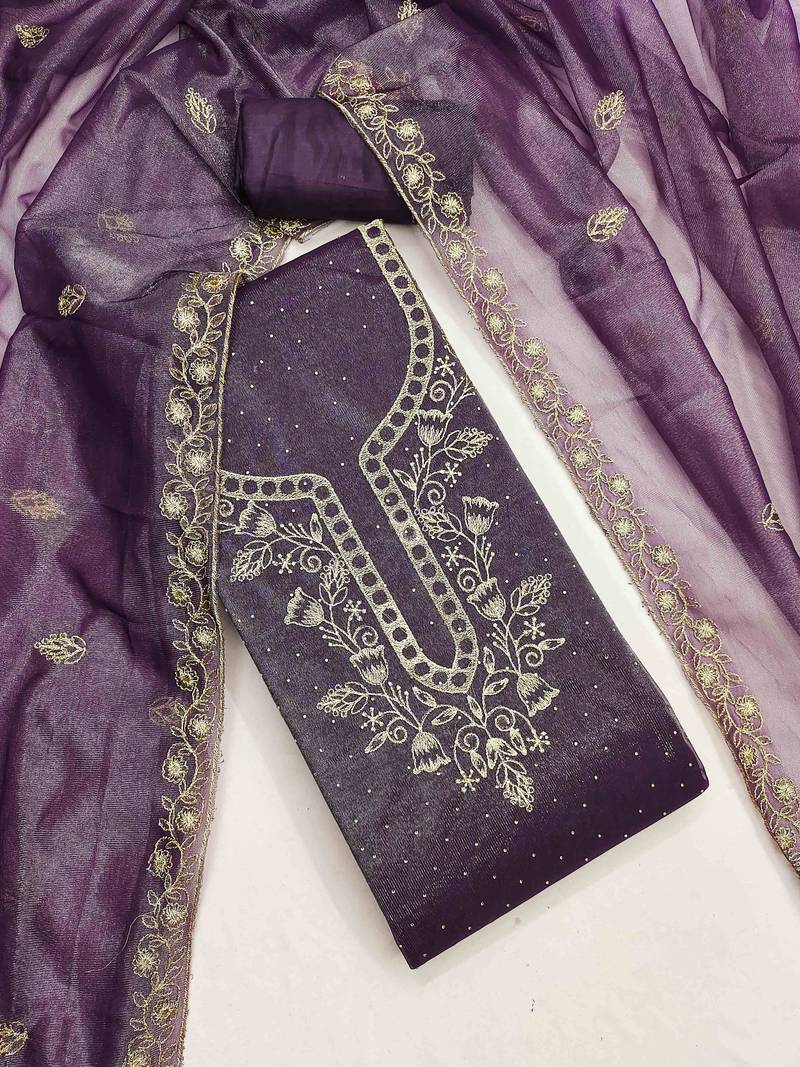 Add Royal Elegance And Luxurious Charm To Your Ethnic Wardrobe With This Women’s Purple Unstitched Diamond Organza Dress Material, Crafted For Women Who Love Rich Colors And Refined Craftsmanship. This Premium Ethnic Fabric Beautifully Blends Modern Sophistication With Traditional Embroidery, Making It A Perfect Choice For Festive And Special Occasions.