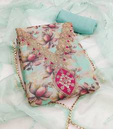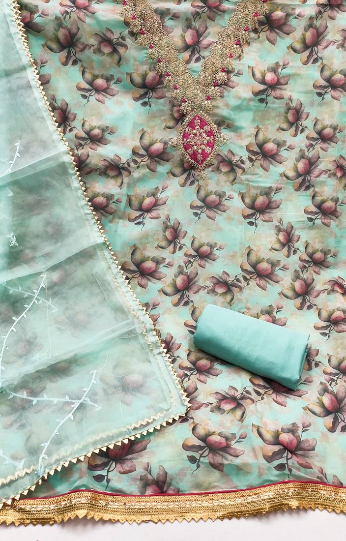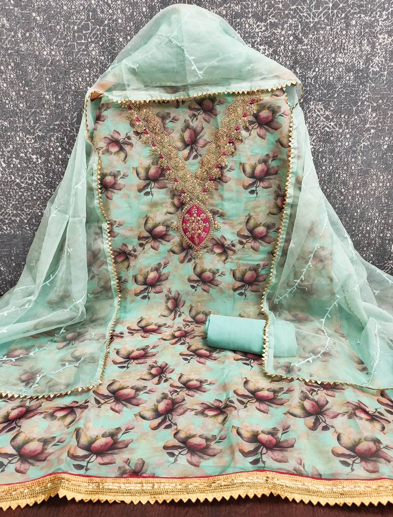 sea green embroidery print organza dress material unstitched