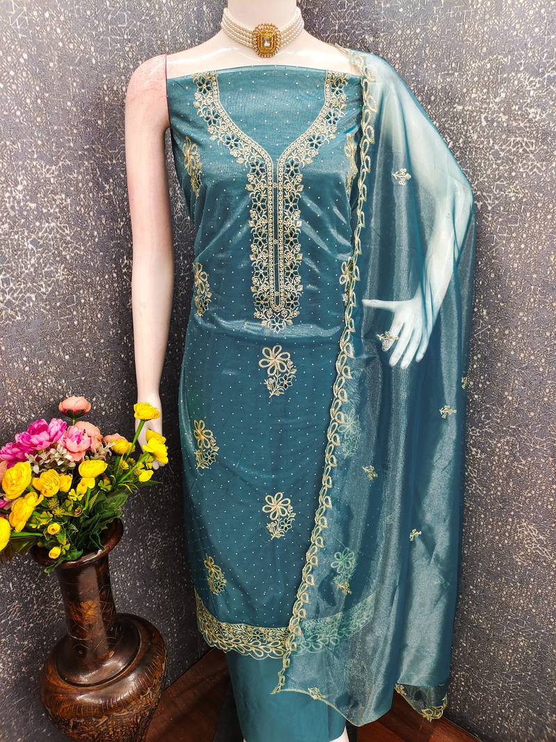 | Product Description | Add A Touch Of Luxury And Elegance To Your Ethnic Wardrobe With This Women’s Teal Unstitched Diamond Organza Dress Material, Crafted For Women Who Love Refined Textures And Premium Craftsmanship. This Designer Ethnic Suit Fabric Blends Modern Sophistication With Traditional Embroidery, Making It A Perfect Choice For Festive And Special Occasions. The Kurta Fabric Is Made From Premium Diamond Organza, Known For Its Lightweight Feel, Sheer Elegance, And Graceful Drape. It Is Beautifully Enhanced With Intricate Embroidery Work, Adding Richness, Depth, And A Luxurious Designer Finish To The Outfit. The Subtle Shimmer Of Organza Combined With Fine Embroidery Creates A Stunning Visual Appeal. |