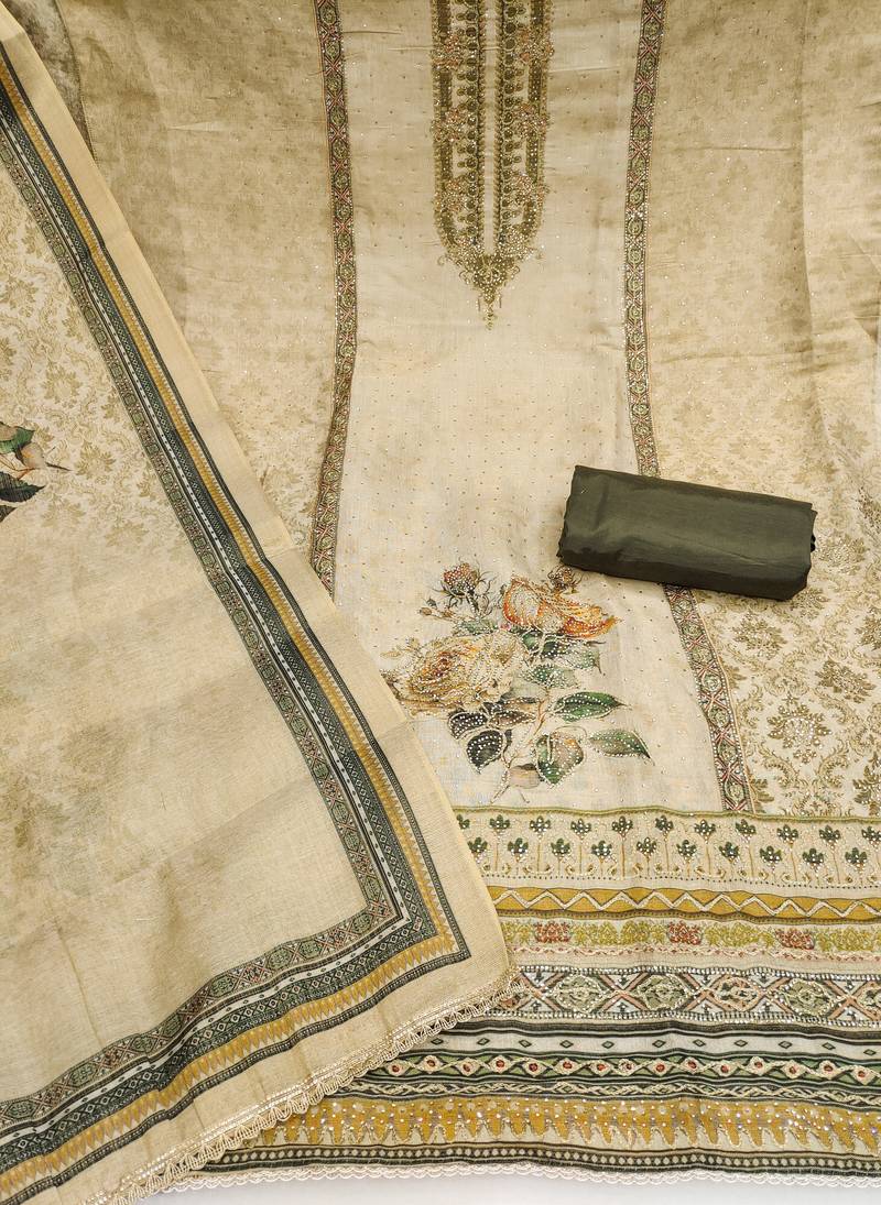 Women's Beige Unstitched Daimond Embroidery And Fancy Border Simmer Cotton Silk Dress Material Having Olive Green Color Unstitched Bottom Of Dull Santoon Fabric And Beige Color Dupatta Of Simmer Cotton Silk Material With Amazing Beige Colour In Simmer Cotton Silk Dull Santoon Fabric With Work Of Heavy Daimond Embroidery And Fancy Border With Designer Printed Dupatta|| Images Are For The Referance Purpose Only, Color Of The Actual Product May Little Vary From The Image Due To Screen Resolution