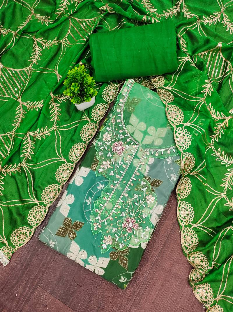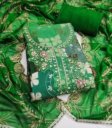 Green cotton silk unstitched handwork dress material