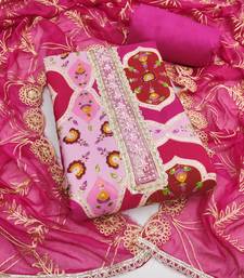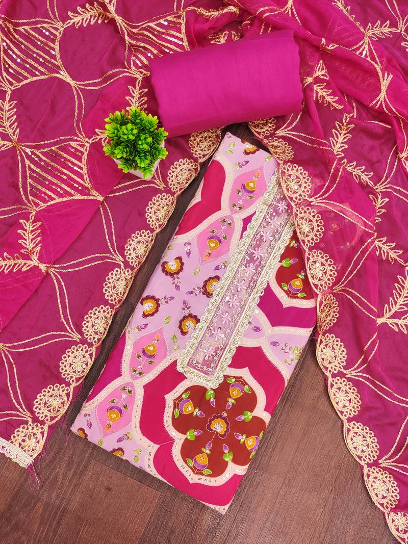 Multicolour pink embroidered viscose silk dress material with printed design unstitched