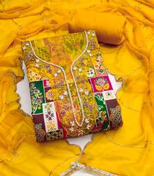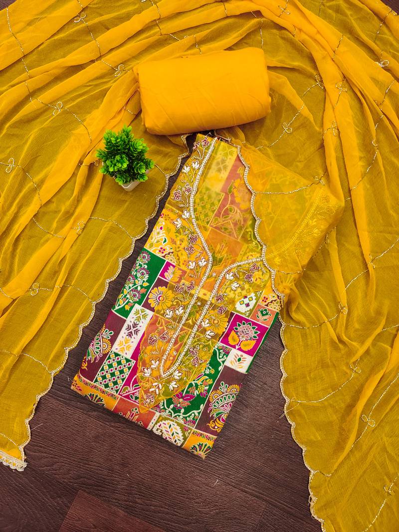 Designer yellow viscose banarasi print handwork dress material unstitched