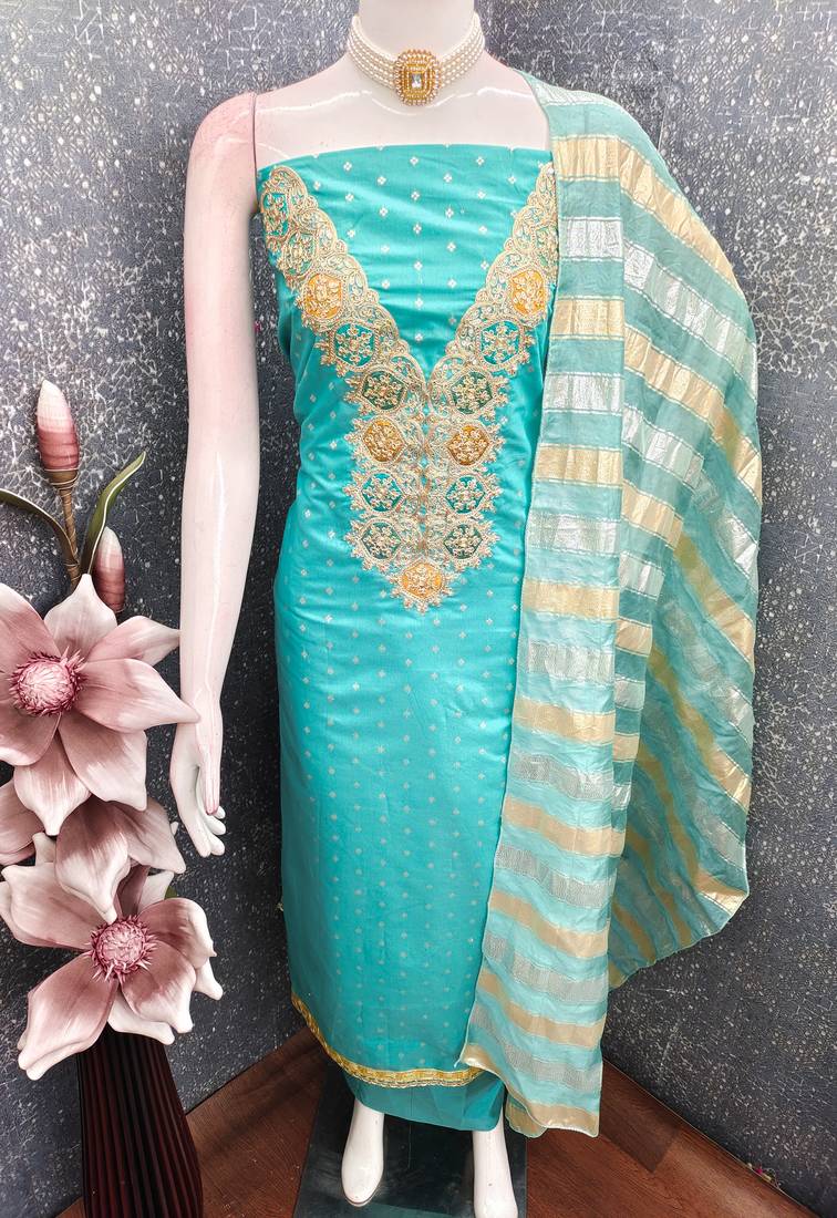 | Product Description | Elevate Your Ethnic Wardrobe With This Luxurious Women’s Sea Green Unstitched Modal Chanderi Butti Dress Material, Crafted For Timeless Elegance And Festive Sophistication. Designed With Premium Fabrics And Rich Craftsmanship, This Beautiful Suit Set Is Perfect For Women Who Appreciate Traditional Detailing With A Modern Ethnic Touch. The Kurta Fabric Is Made From Premium Modal Chanderi Butti, Beautifully Enhanced With Heavy Weaving Embroidery On The Neckline And An Elegant Fancy Woven Border, Giving It A Rich, Designer Look. The Subtle Shine And Soft Texture Of Modal Chanderi Add Grace, Comfort, And A Royal Finish To The Outfit. The Set Includes A Sea Green Unstitched Santoon Fabric Bottom, Offering Excellent Comfort, Smooth Texture, And Durability For Daily Or Occasion Wear. Completing The Ensemble Is A Stunning Multi Color Cotton Silk Jacquard Dupatta, Designed With Designer Woven Patterns That Add Contrast, Vibrancy, And Festive Charm To The Overall Look. This Unstitched Dress Material Allows You To Customize The Fit And Style As Per Your Preference, Making It Perfect For Festive Wear, Wedding Functions, Family Celebrations, Traditional Ceremonies, Parties, And Cultural Events. Designed For Elegance And Versatility, This Ethnic Suit Set Blends Premium Fabrics, Rich Weaving, And Classic Craftsmanship Into One Beautiful Ensemble. |