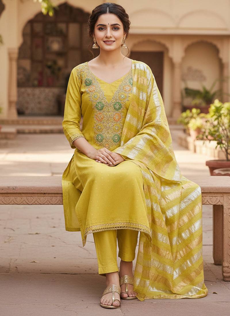 Add Rich Elegance And Timeless Charm To Your Ethnic Wardrobe With This Women’s Green Dress Material, Beautifully Designed With Premium Fabrics And Traditional Weaving Artistry. This Luxurious Ethnic Suit Set Blends Heritage Craftsmanship With Modern Sophistication, Making It A Perfect Choice For Festive And Special Occasions.