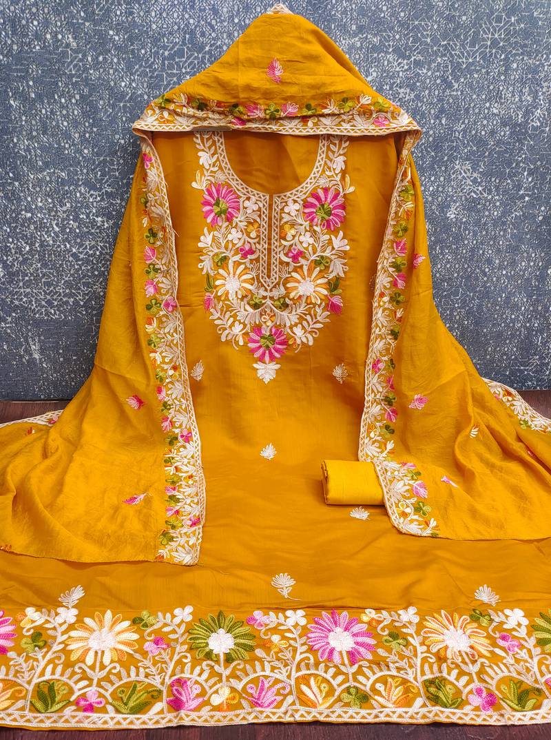 Women's yellow embroidery silk dress material unstitched