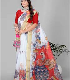 White peackock linen cotton digital print saree