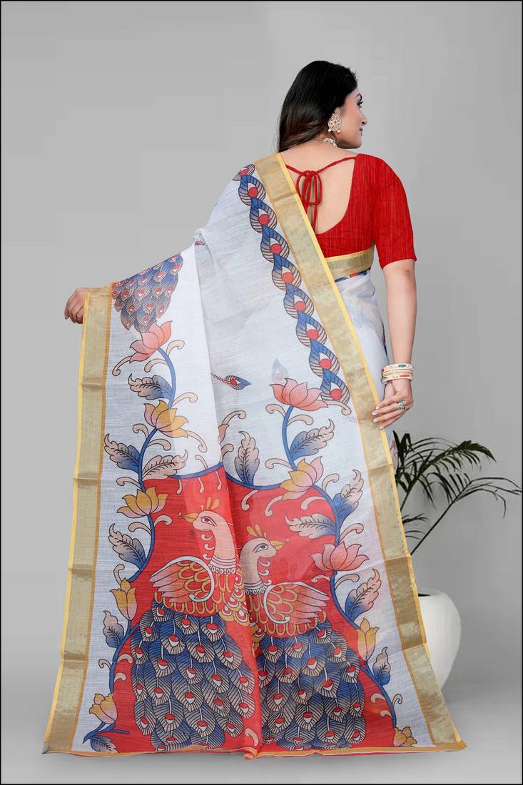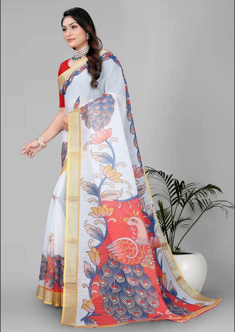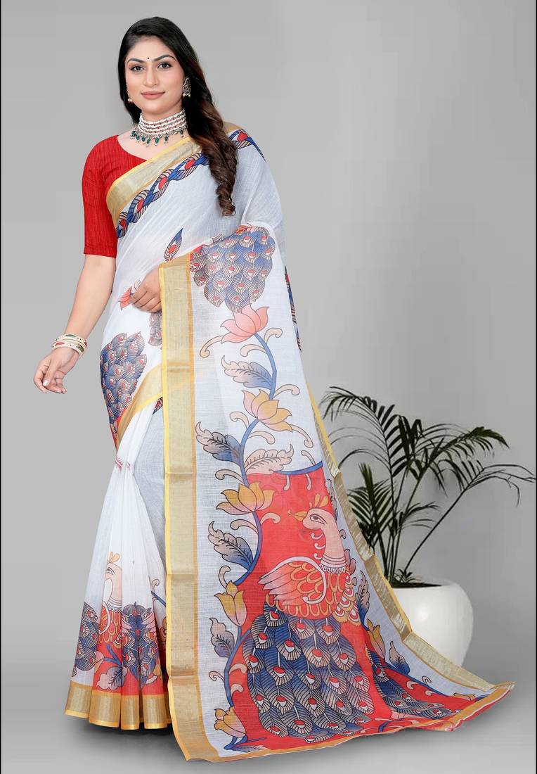 | Product Name | White Peackock Linen Cotton Digital Print Saree | |