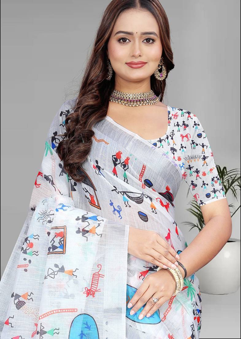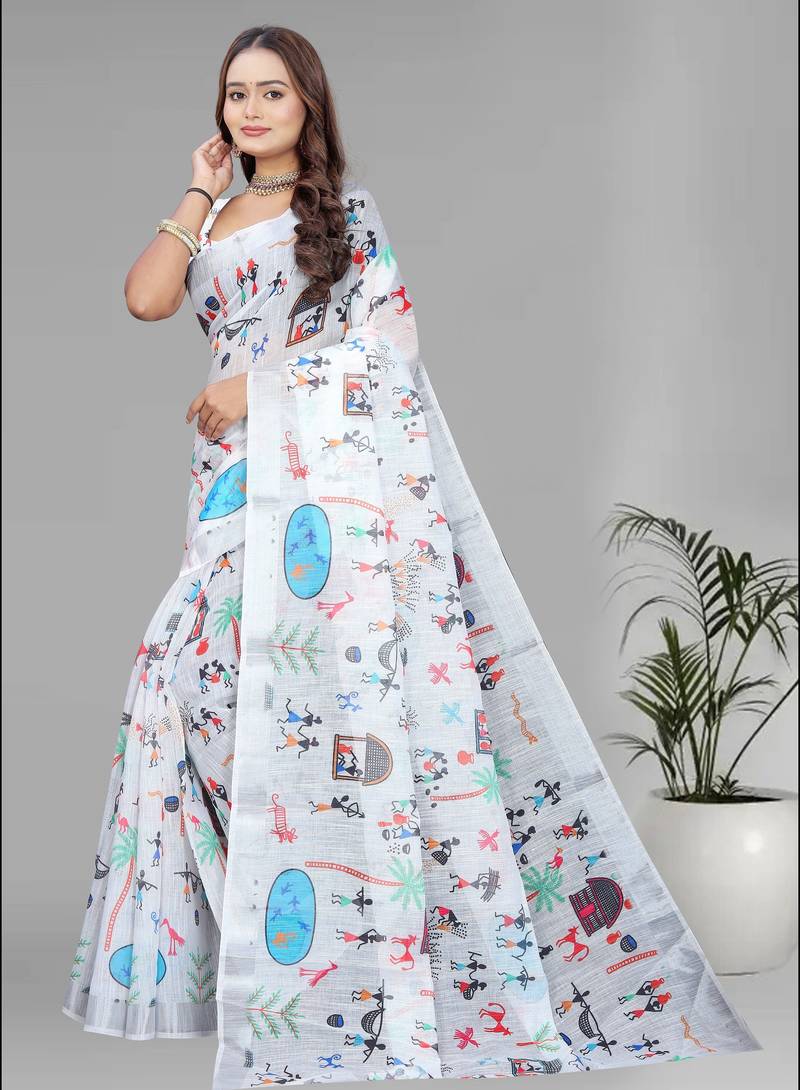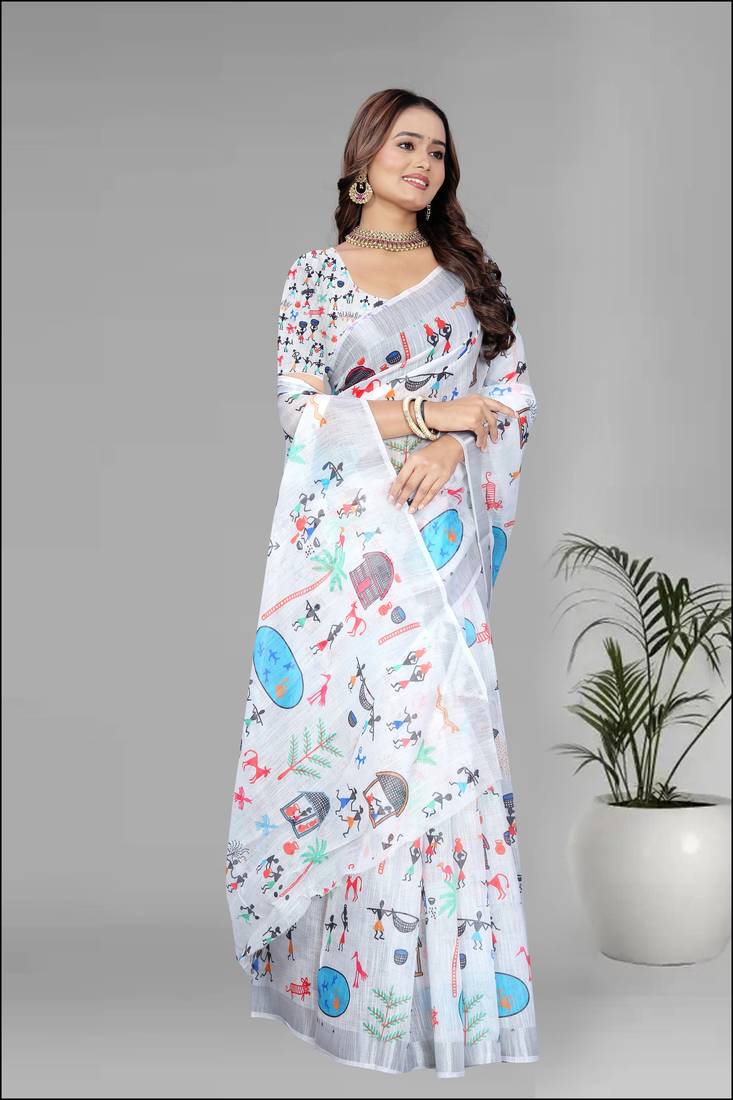 | Product Name | White Colour Linen Cotton Varli Digital Print Saree | |