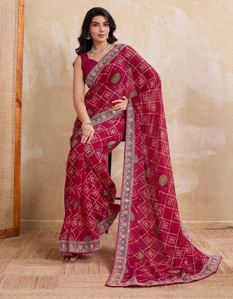 | Product Name | Appetizing Pink Georgette Bandhej Print With Cutwork Lace Border Saree With Mono Banglory Silk Blouse | |