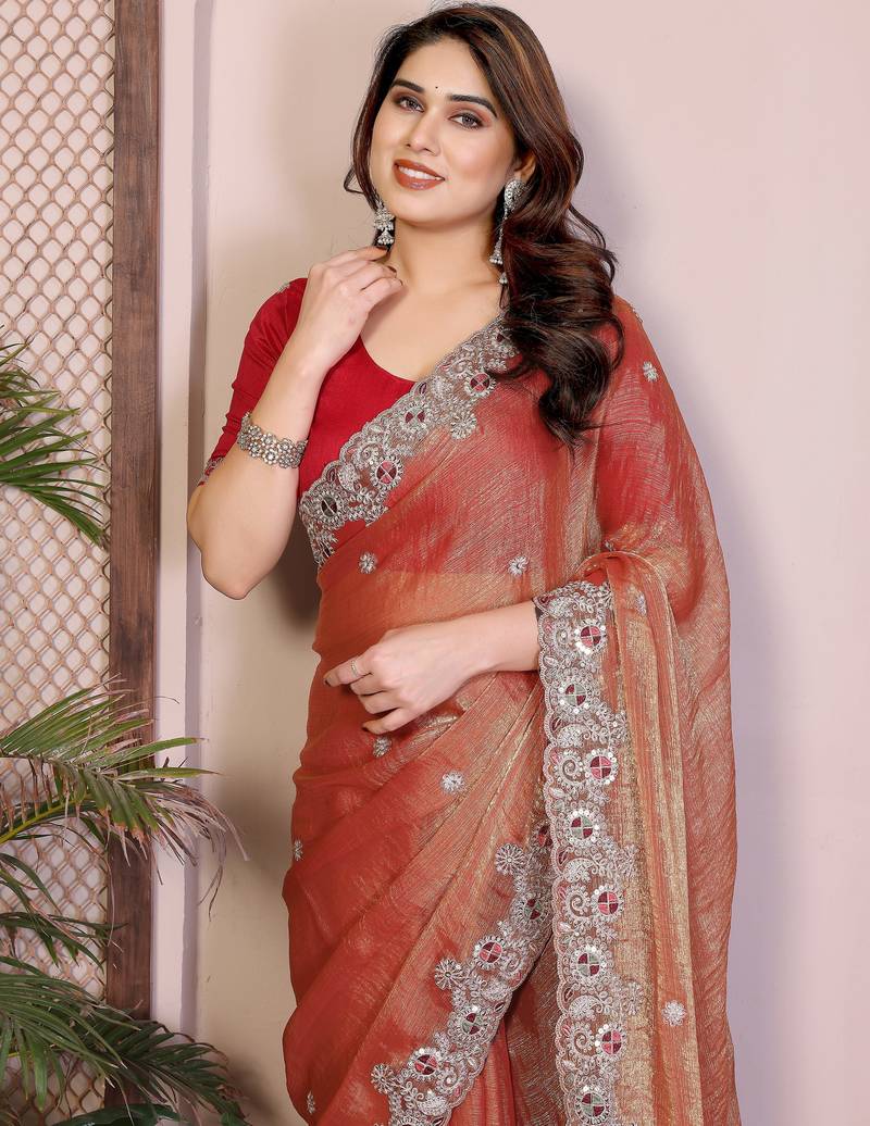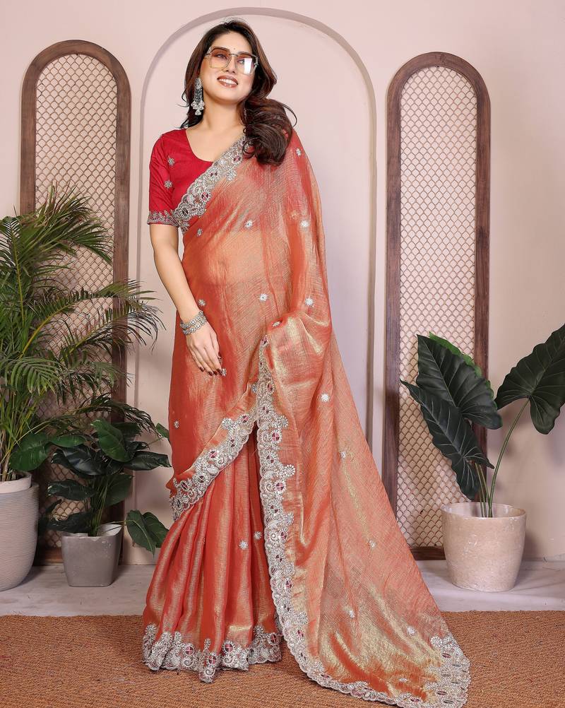 Product Name Colorful Orange Frendy Chiffon Embroidery Multi Sequence Work Indian Designer Traditional Saree