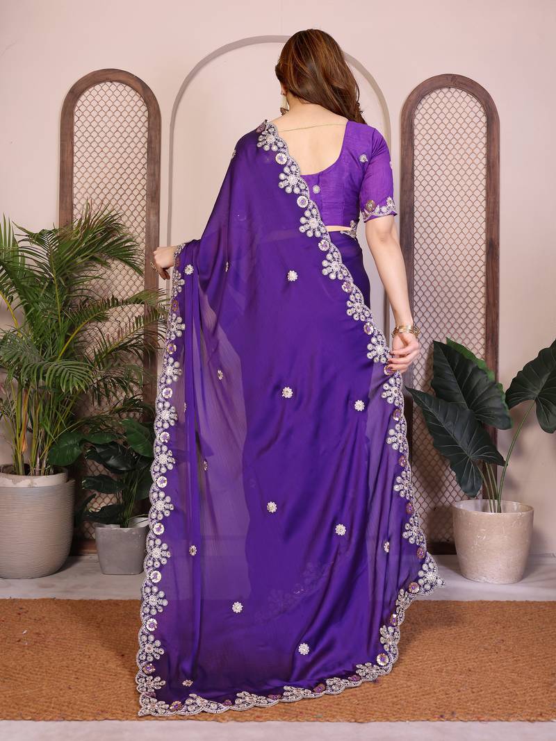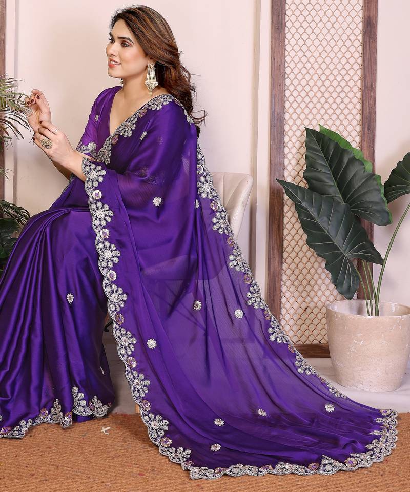 Dazzling blue satin chiffon embroidery multi sequence work indian party wear saree