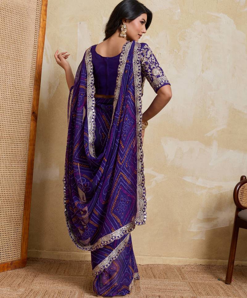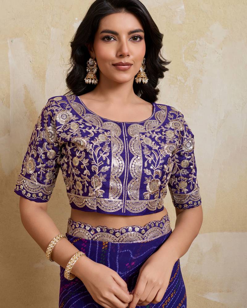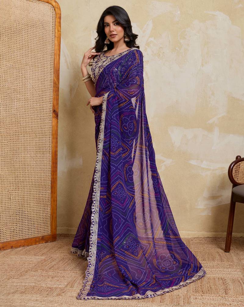 | Product Name | Delightful Blue Georgette Bandhej Print With Cutwork Lace Border Saree With Mono Banglory Silk Blouse | |