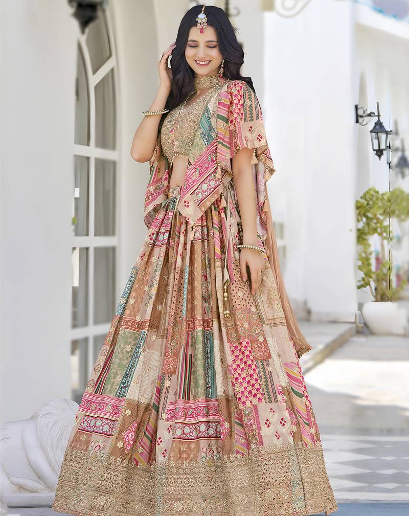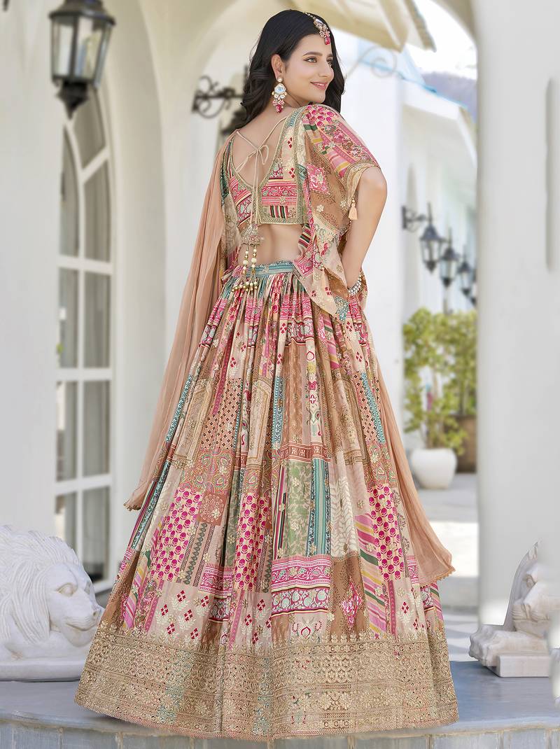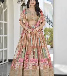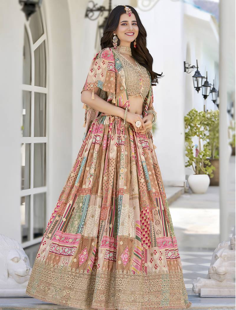 Enchanting beige digital printed with dori and zari embroidery work chinnon silk fabric indian lehenga choli dress