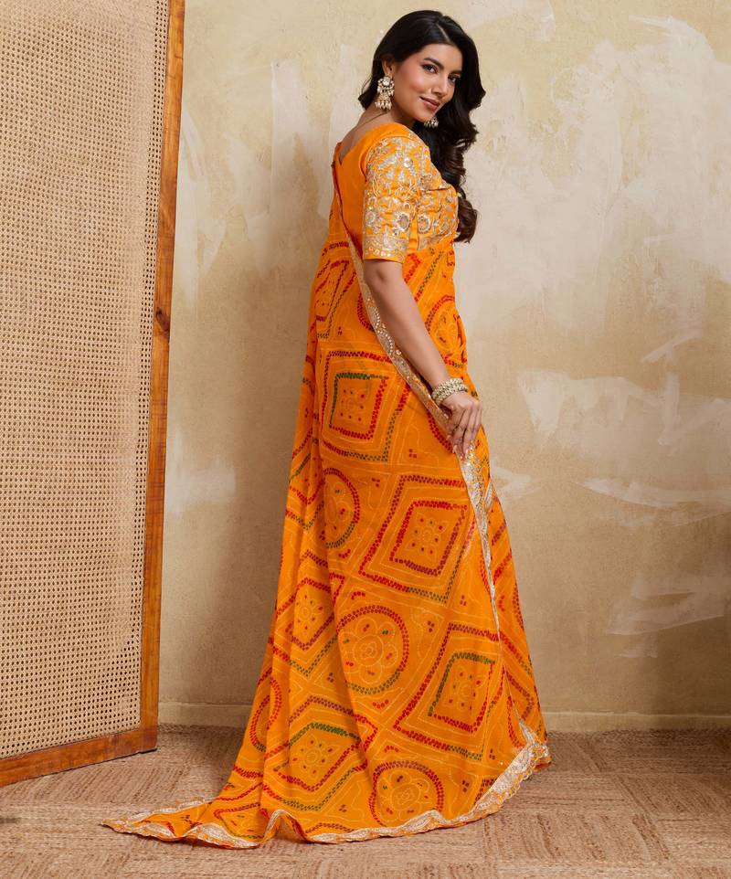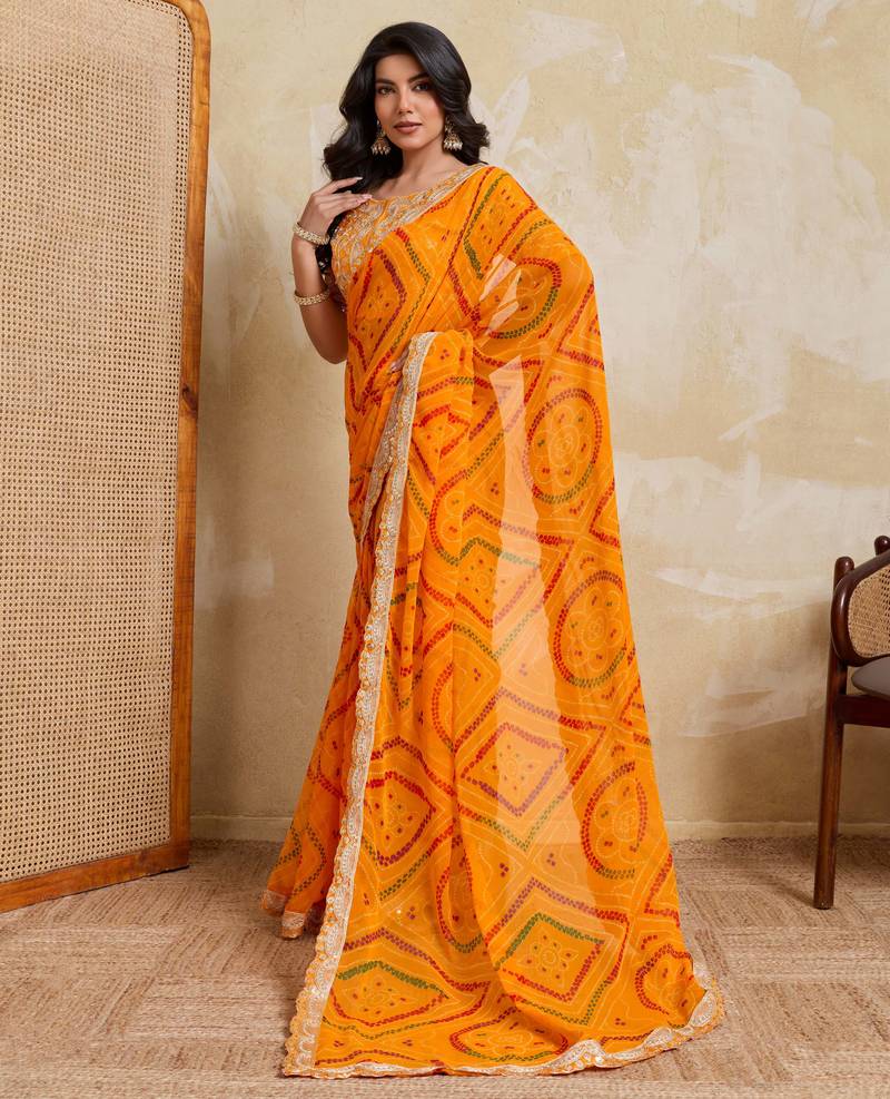 | Product Name | Enchanting Yellow Georgette Bandhej Print With Cutwork Lace Border Saree With Mono Banglory Silk Blouse | |