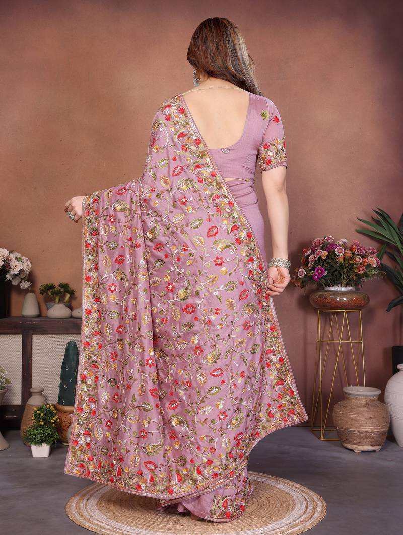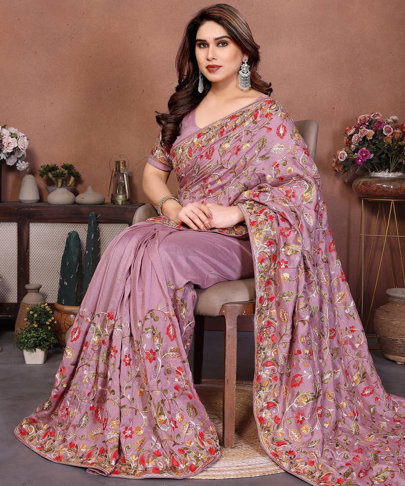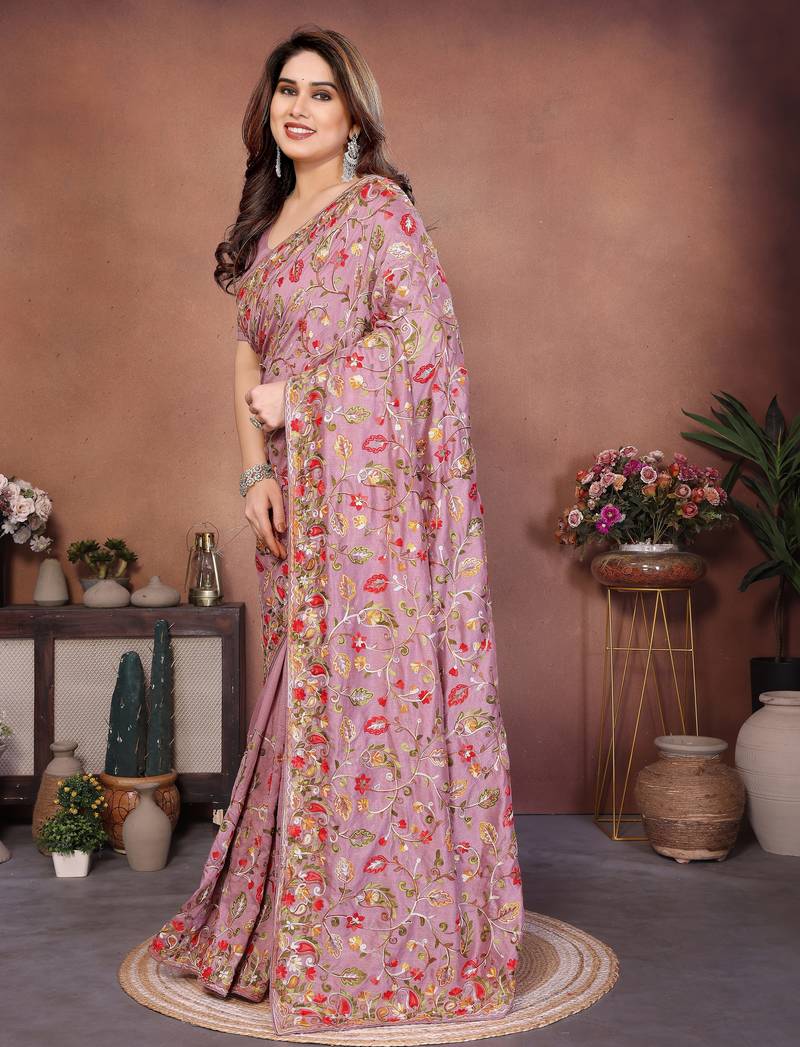 Enticing pink vichitra silk embroidery multi chain work indian designer traditional saree