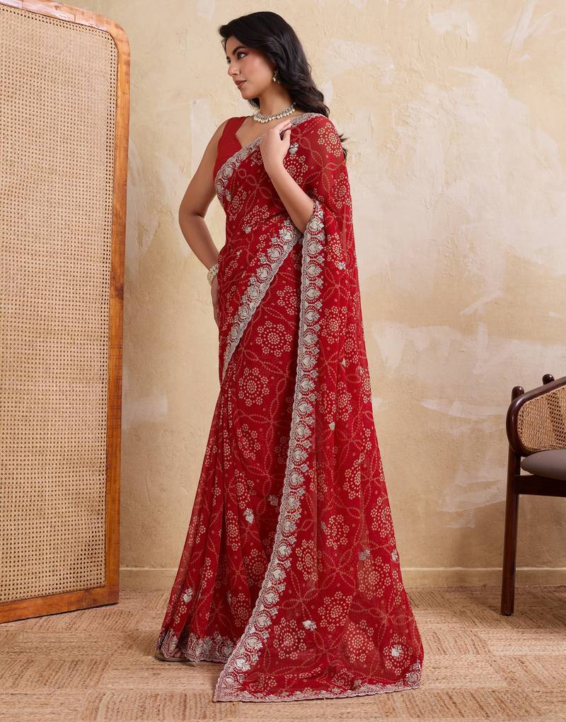 Entrancing red georgette bandhej print with cutwork lace border saree with mono banglory silk blouse