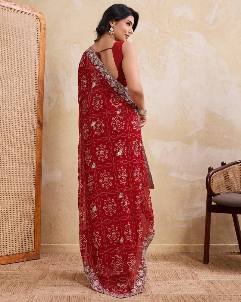 | Product Name | Entrancing Red Georgette Bandhej Print With Cutwork Lace Border Saree With Mono Banglory Silk Blouse | |