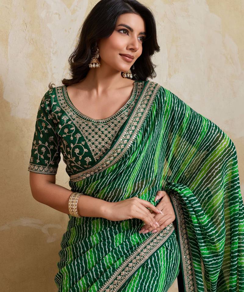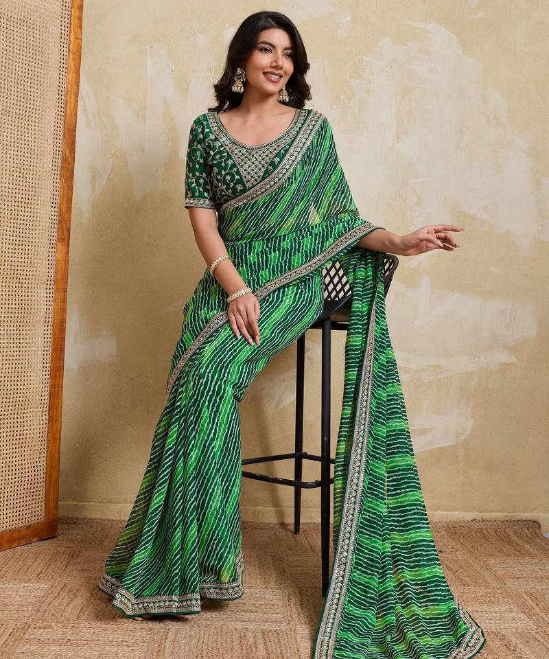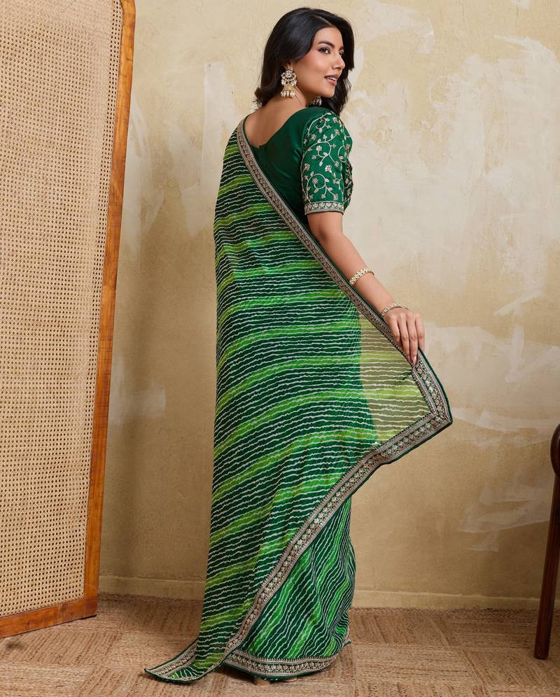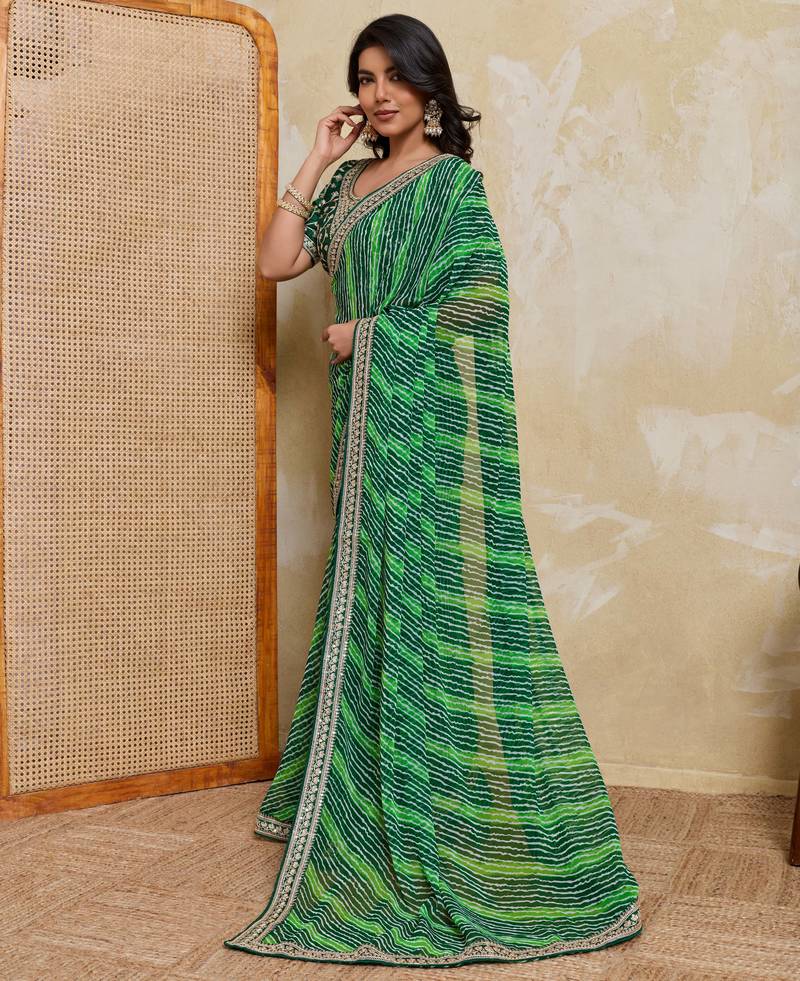 | Product Name | Glamorous Green Georgette Bandhej Print With Embroidery Work Lace Border Saree With Mono Banglory Silk Blouse | |