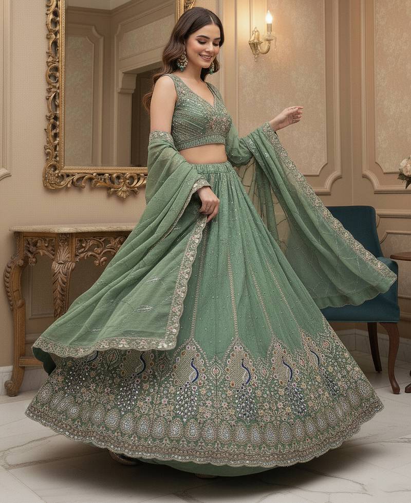 Glamorous Pista Peacock Dori, Sequins Embroidered with Zircon Diamond work Gadhwal Silk wedding lehenga for women