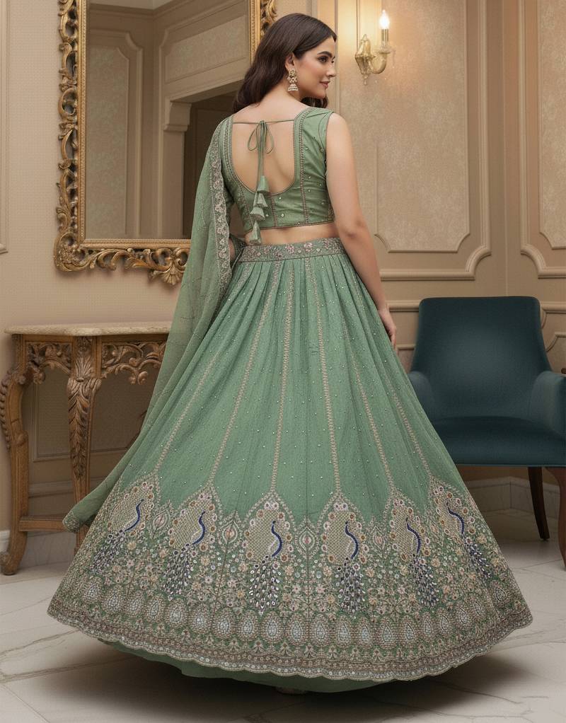 Product Name Glamorous Pista Peacock Dori, Sequins Embroidered With Zircon Diamond Work Gadhwal Silk Wedding Lehenga For Women