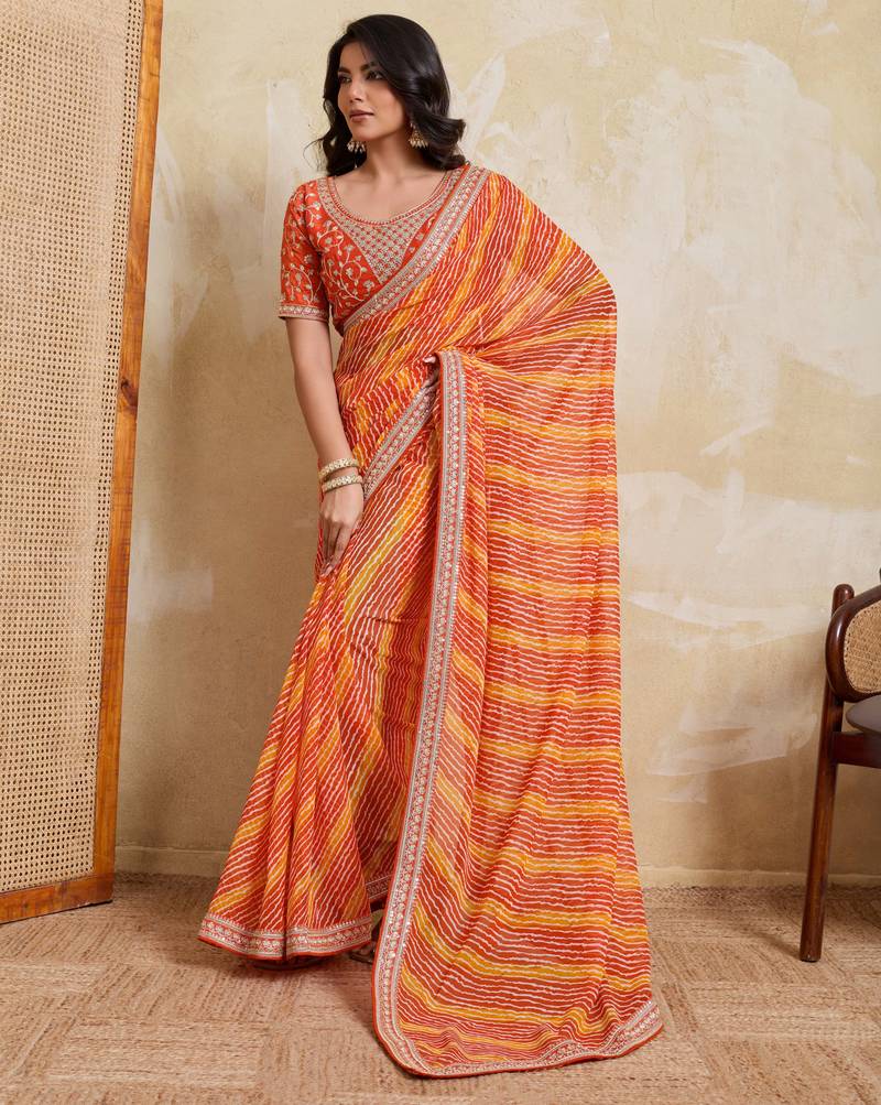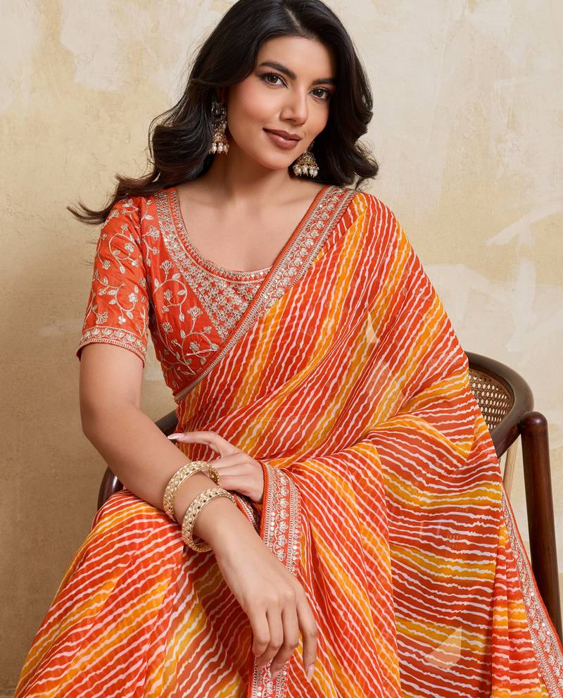 | Product Name | Glamourous Orange Georgette Bandhej Print With Embroidery Work Lace Border Saree With Mono Banglory Silk Blouse | |