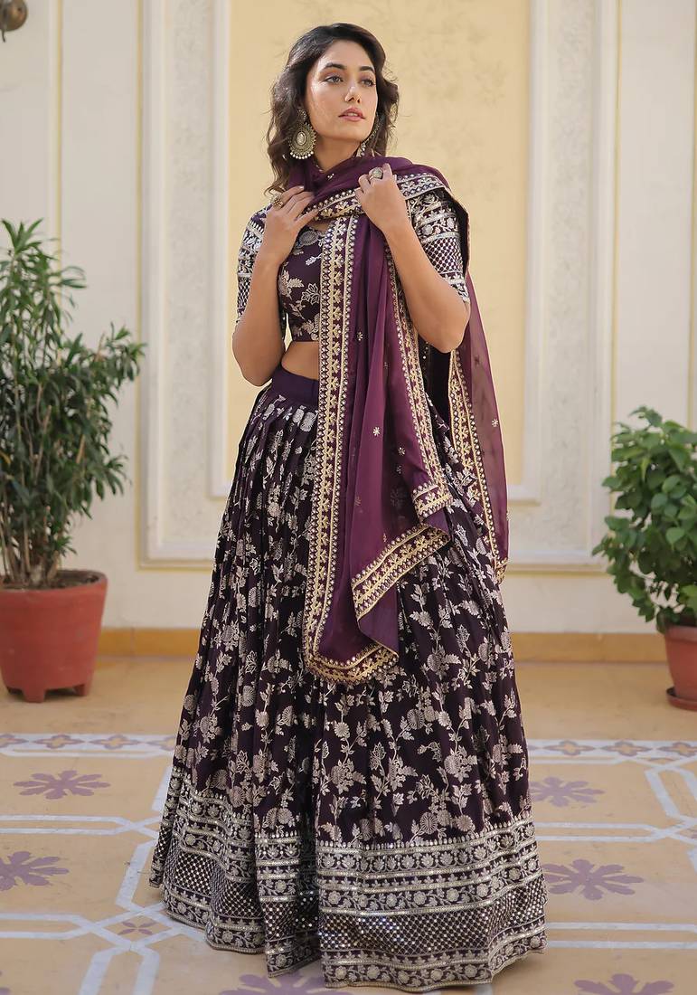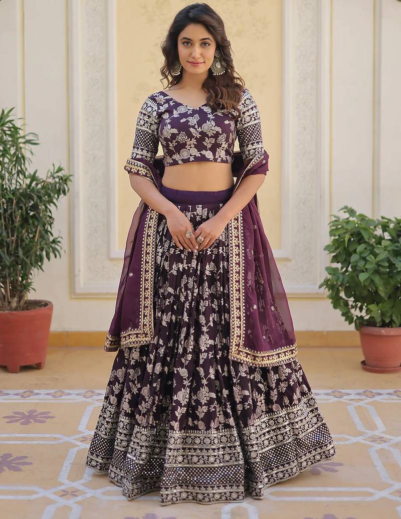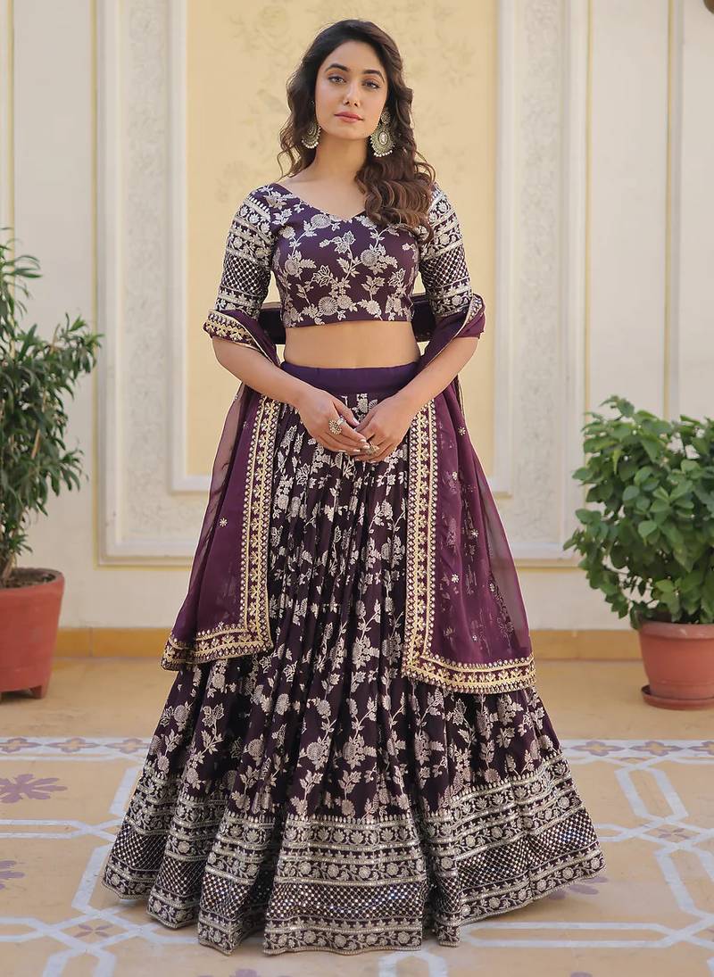 Product Name Gorgeous Wine Embroidery With Sequin And Zari Dola Silk Jacquard Indian Designer Wedding And Party Lehenga