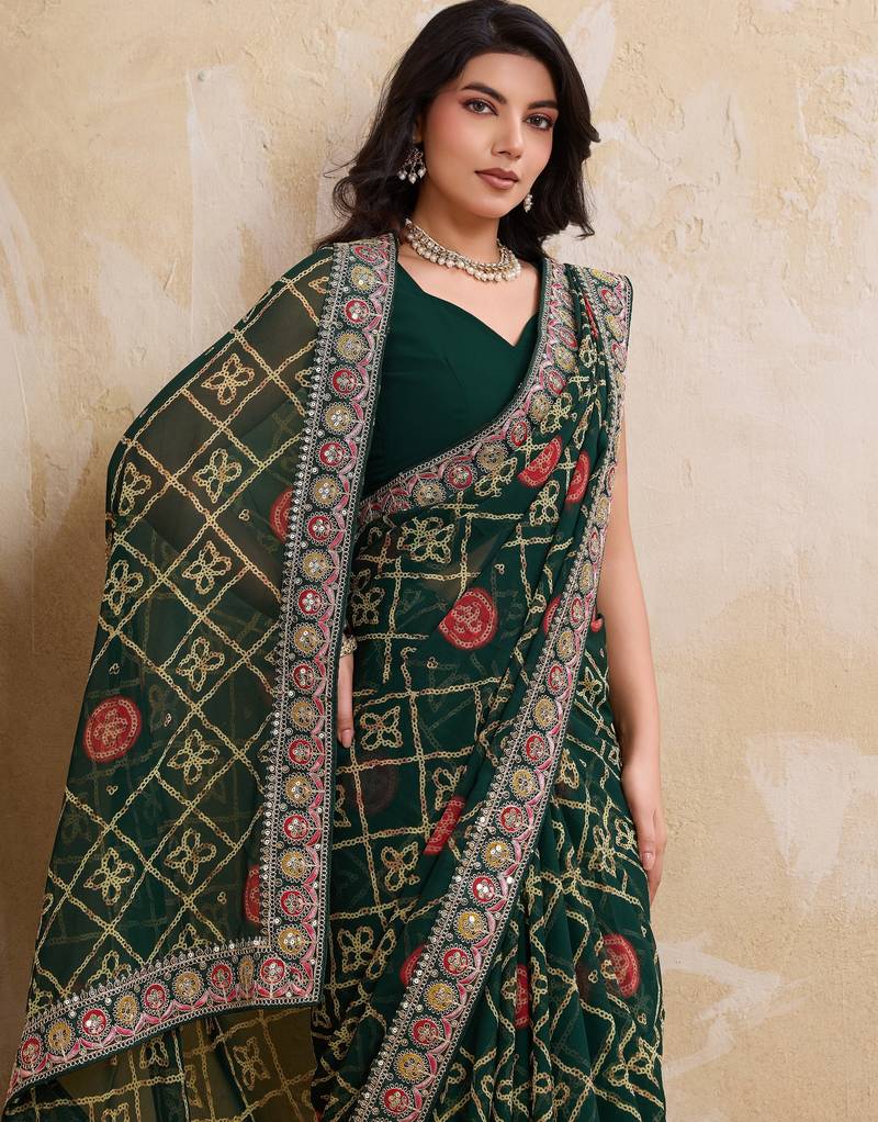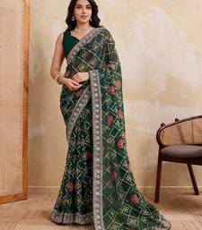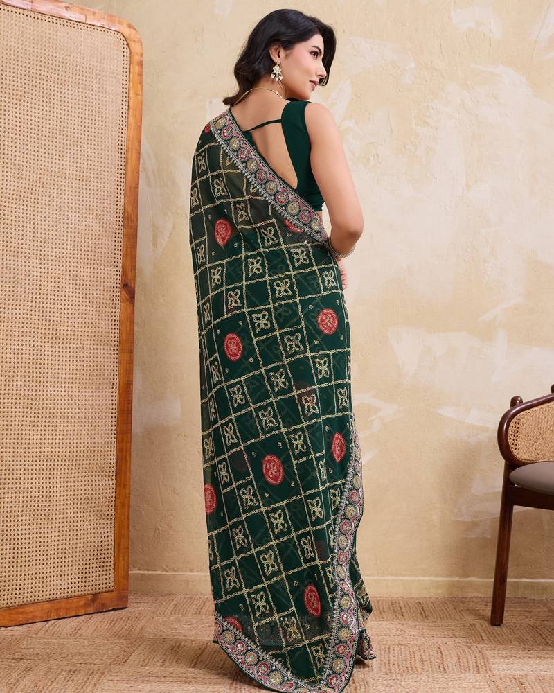 | Product Name | Inviting Green Georgette Bandhej Print With Cutwork Lace Border Saree With Mono Banglory Silk Blouse | |