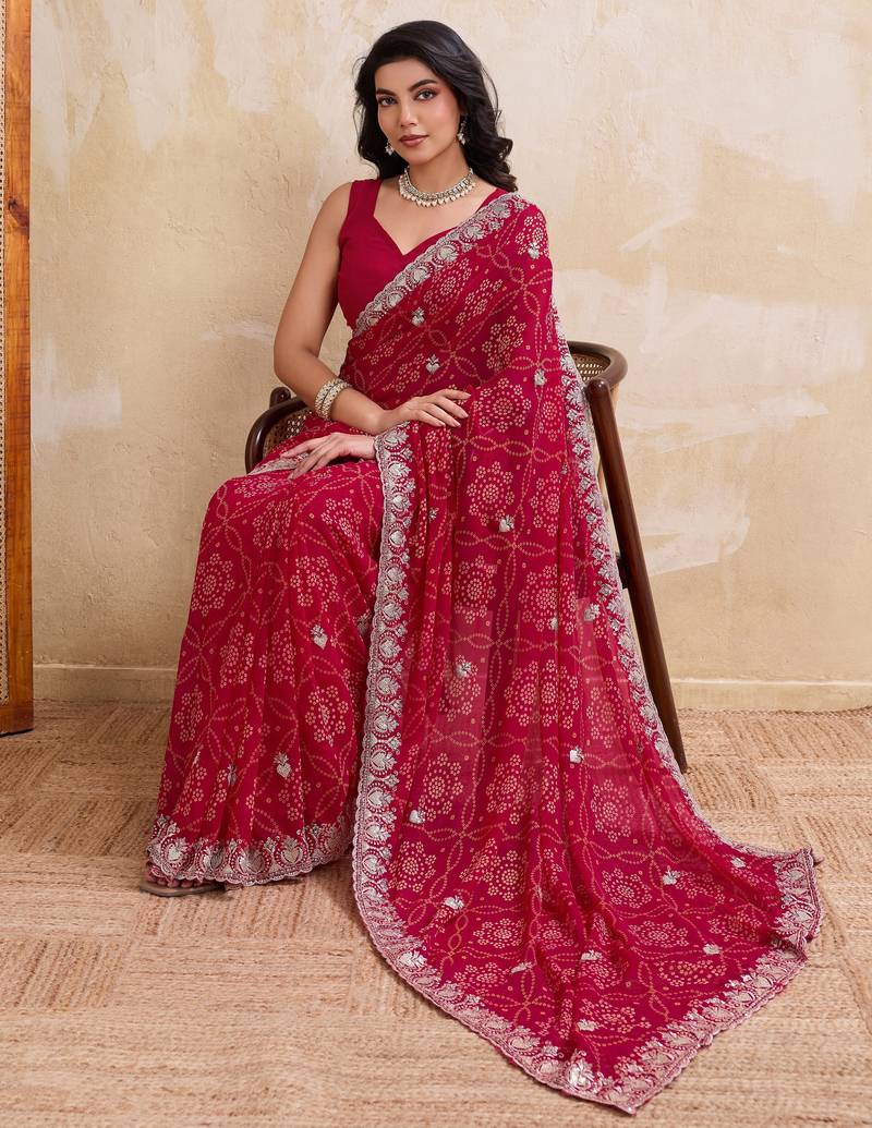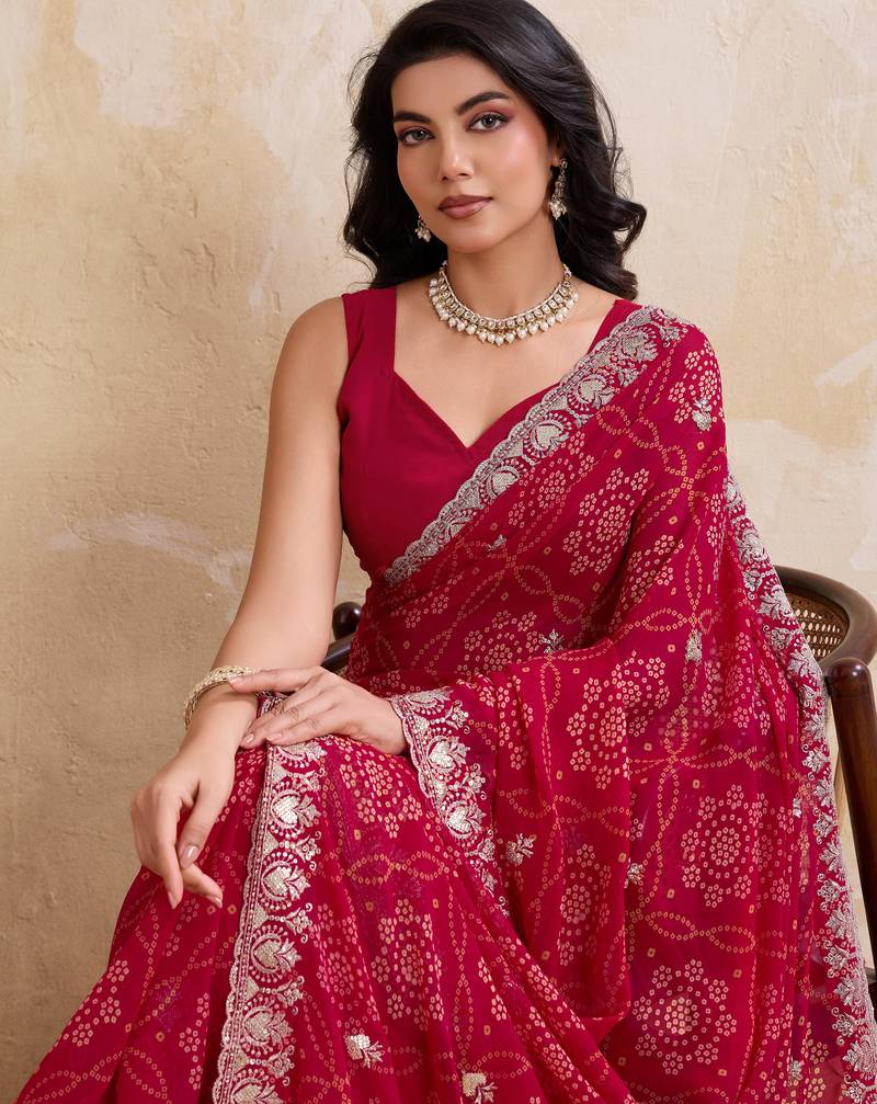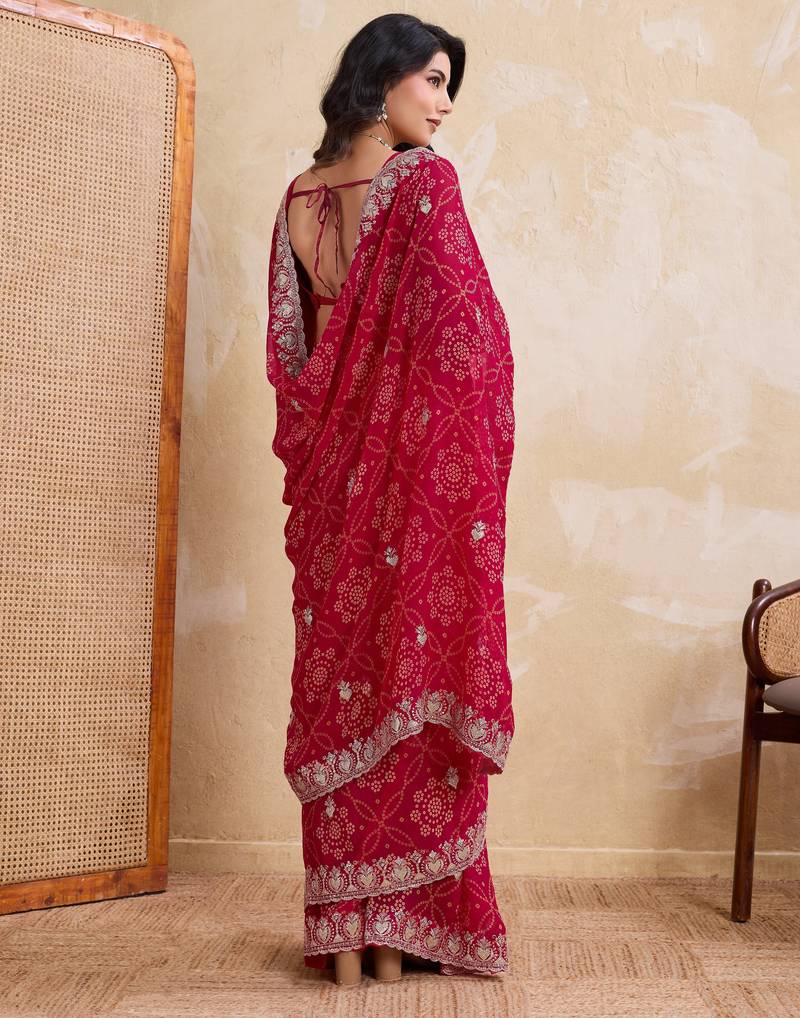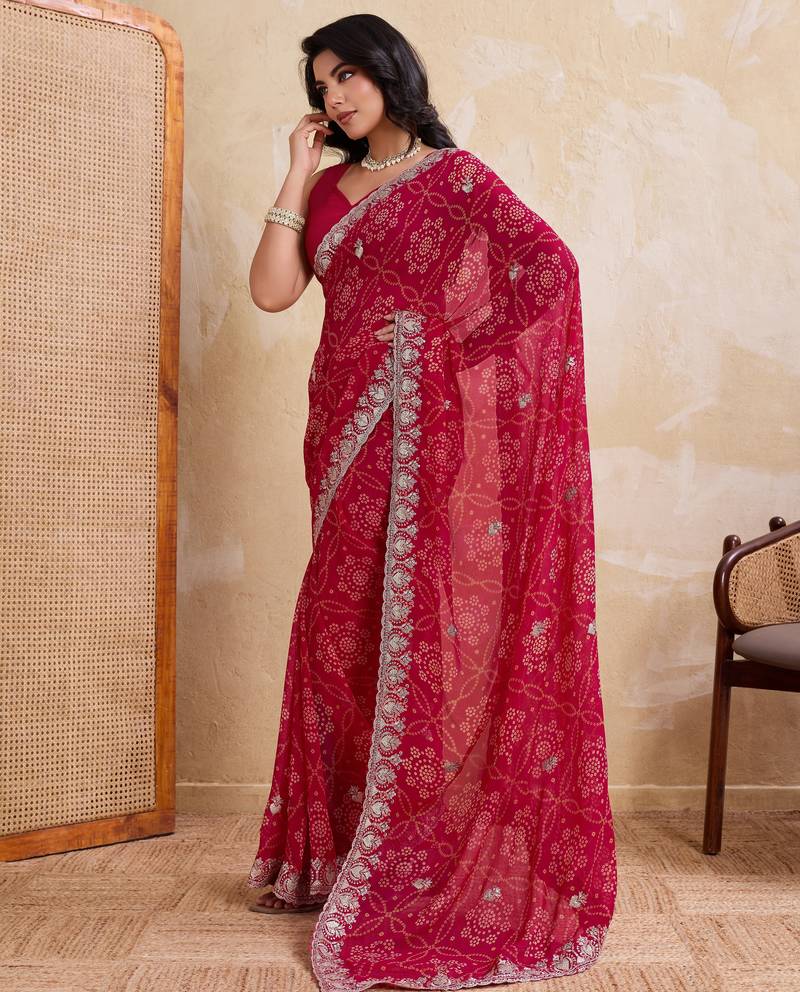 Irresistible pink georgette bandhej print with cutwork lace border saree with mono banglory silk blouse