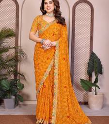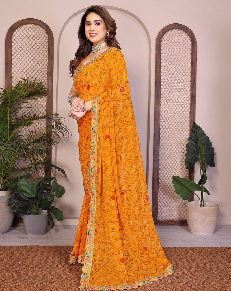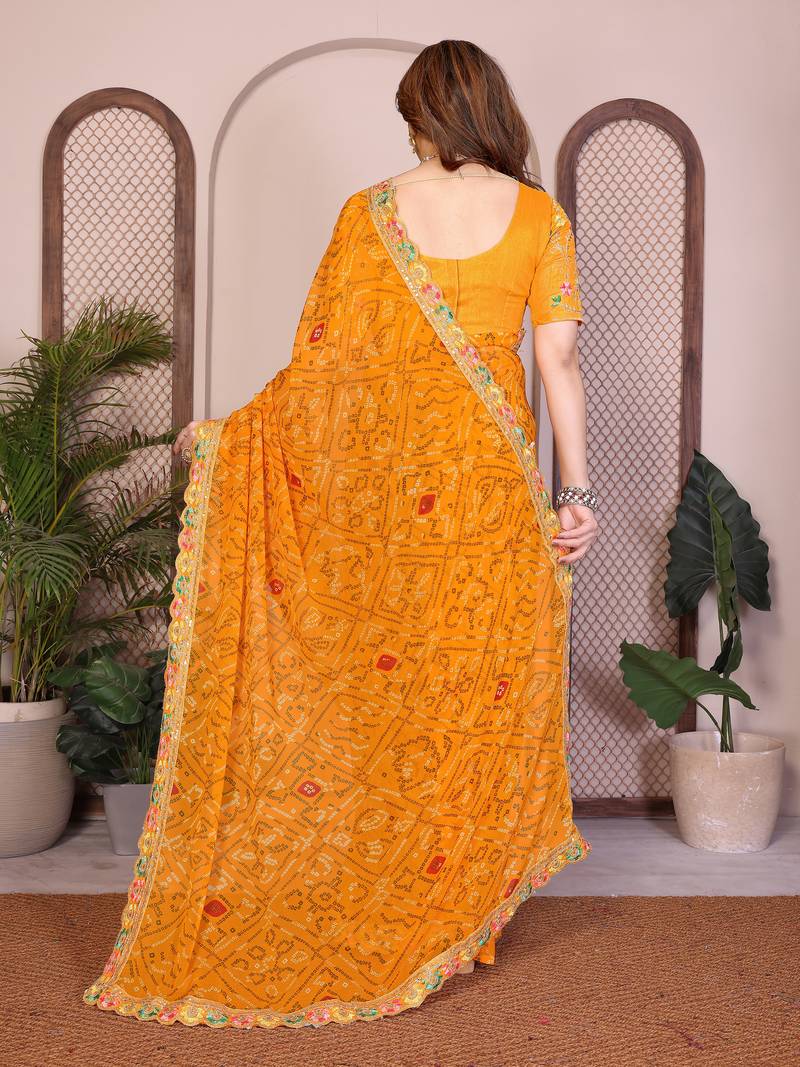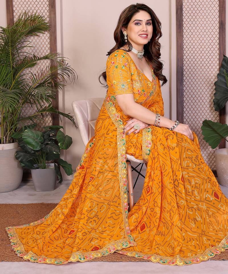 | Product Name | Likable Yellow Georgette Bandhej Print With Cutwork Lace Border Saree With Mono Banglory Silk Blouse | |