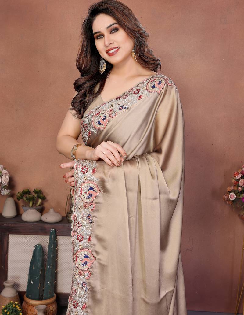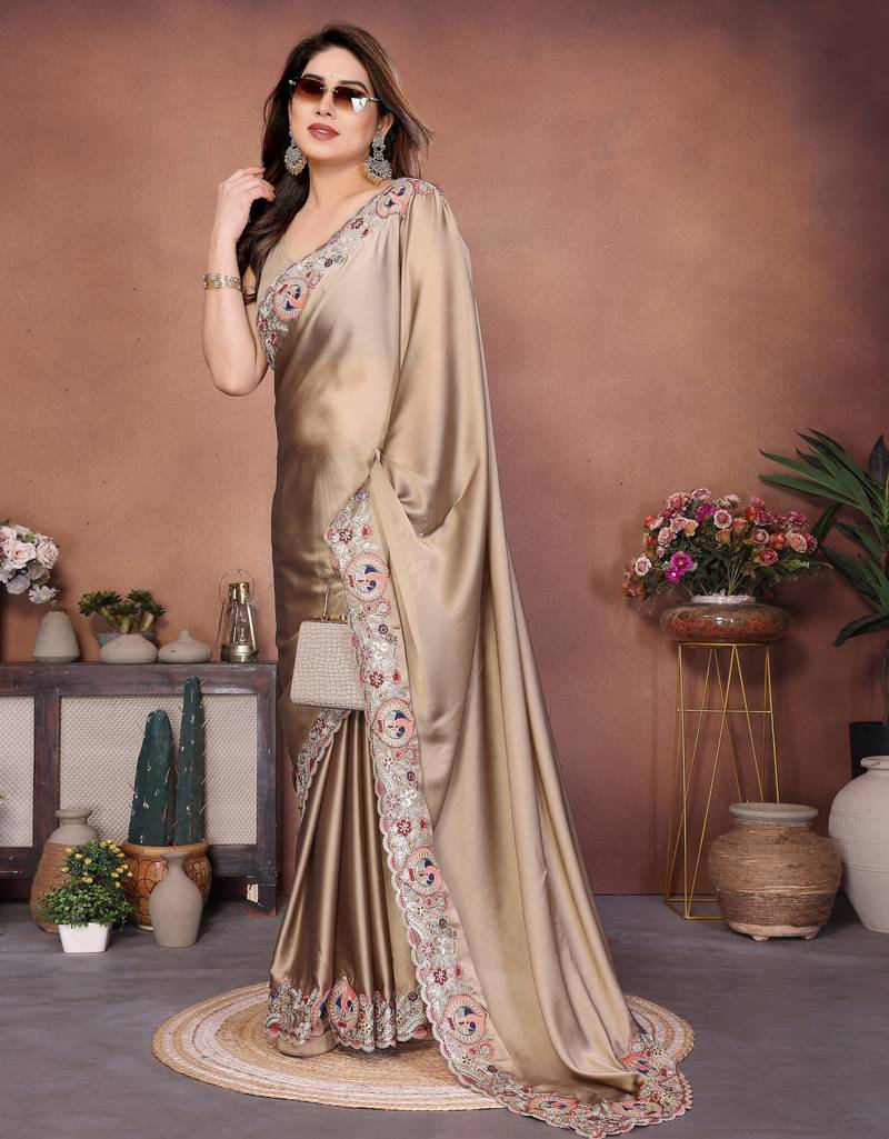 Lovely golden beige rangoli silk embroidery multy sequence work saree with mono banglory silk blouse