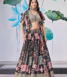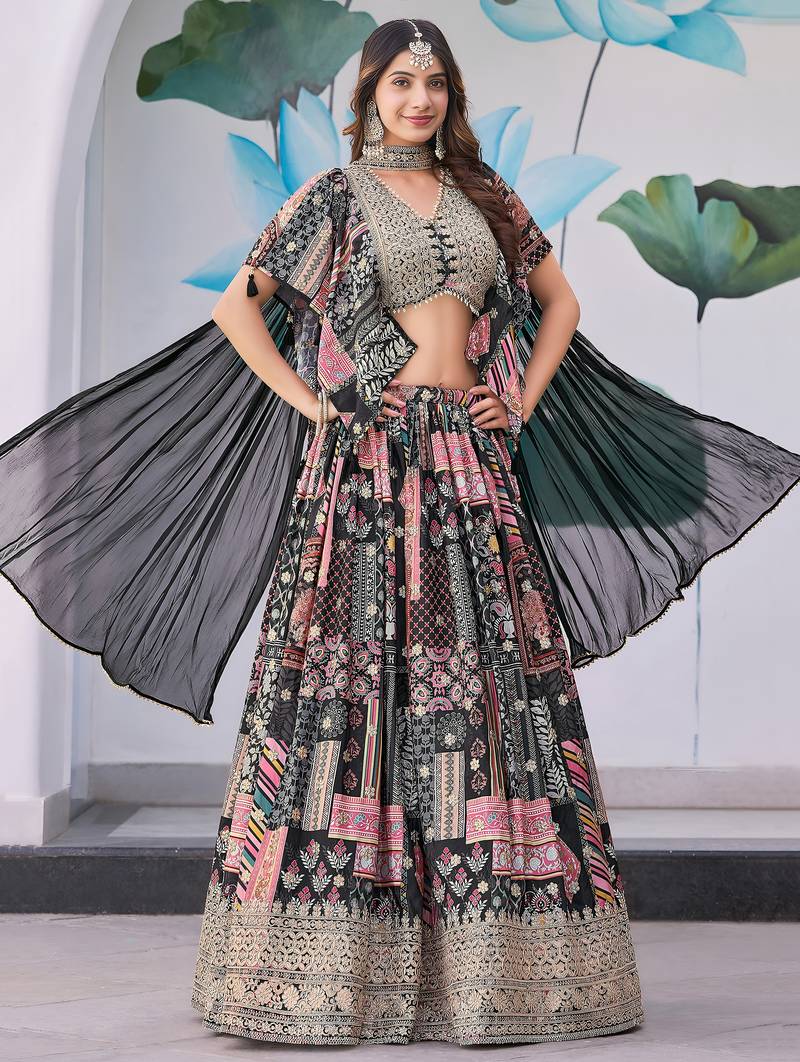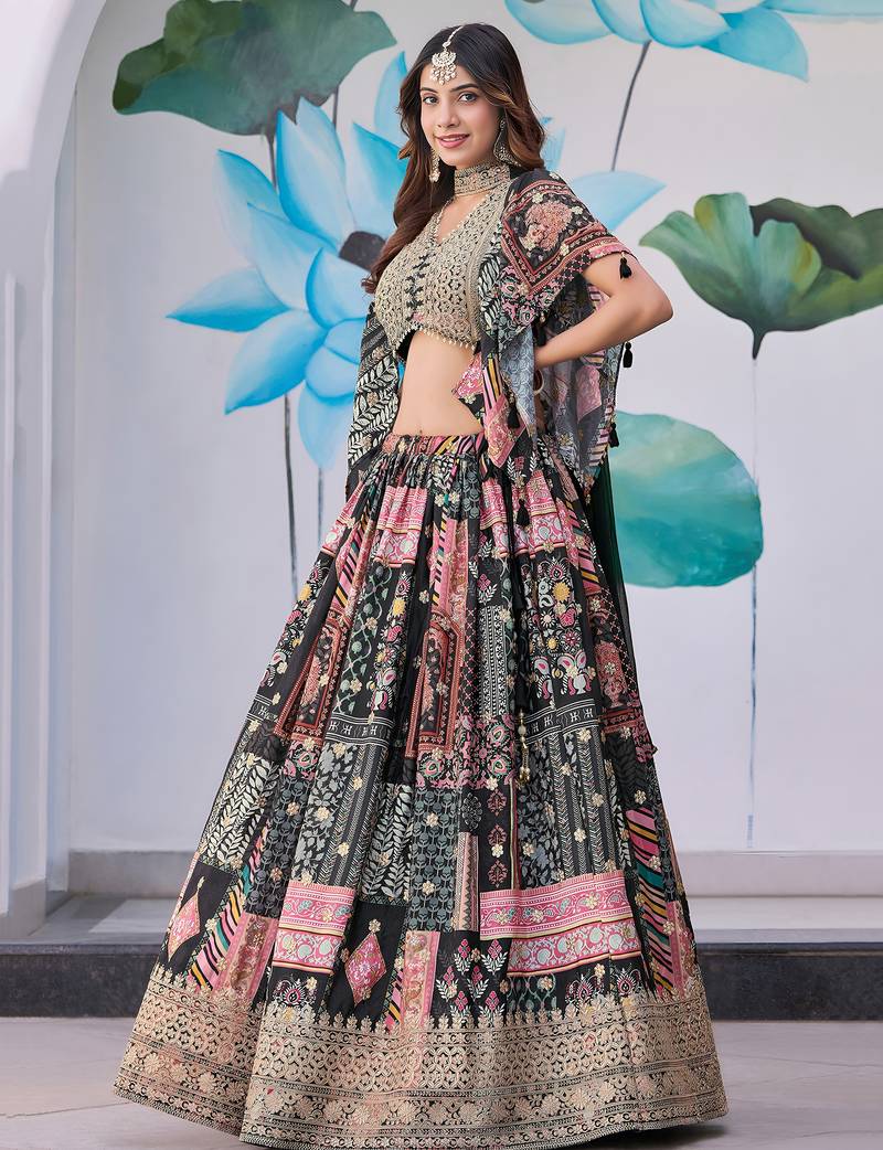 | Product Name | Mesmerizing Black Digital Printed With Dori And Zari Embroidery Work Chinnon Silk Fabric Indian Designer Lehenga Dress | |