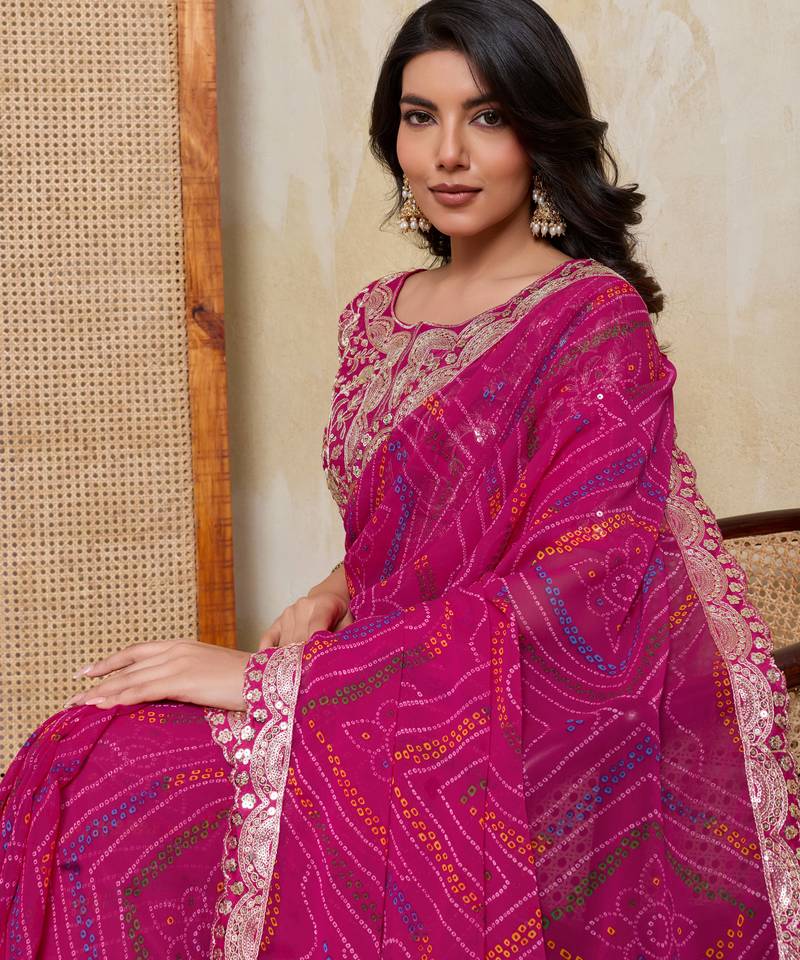 Mesmerizing pink georgette bandhej print with cutwork lace border saree with mono banglory silk blouse