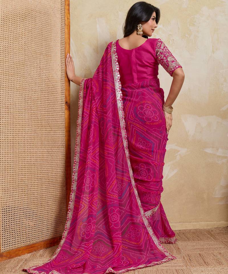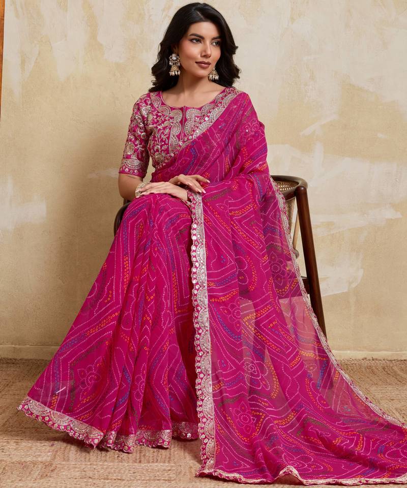 | Product Name | Mesmerizing Pink Georgette Bandhej Print With Cutwork Lace Border Saree With Mono Banglory Silk Blouse | |