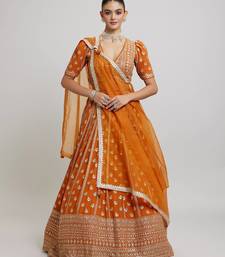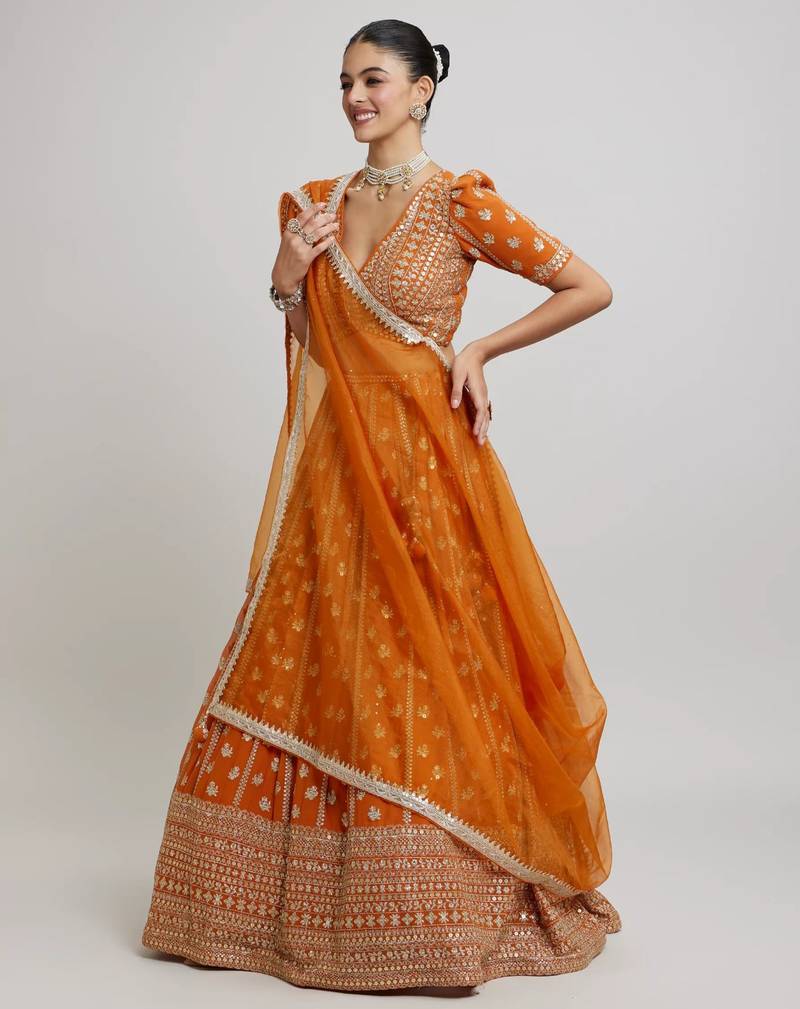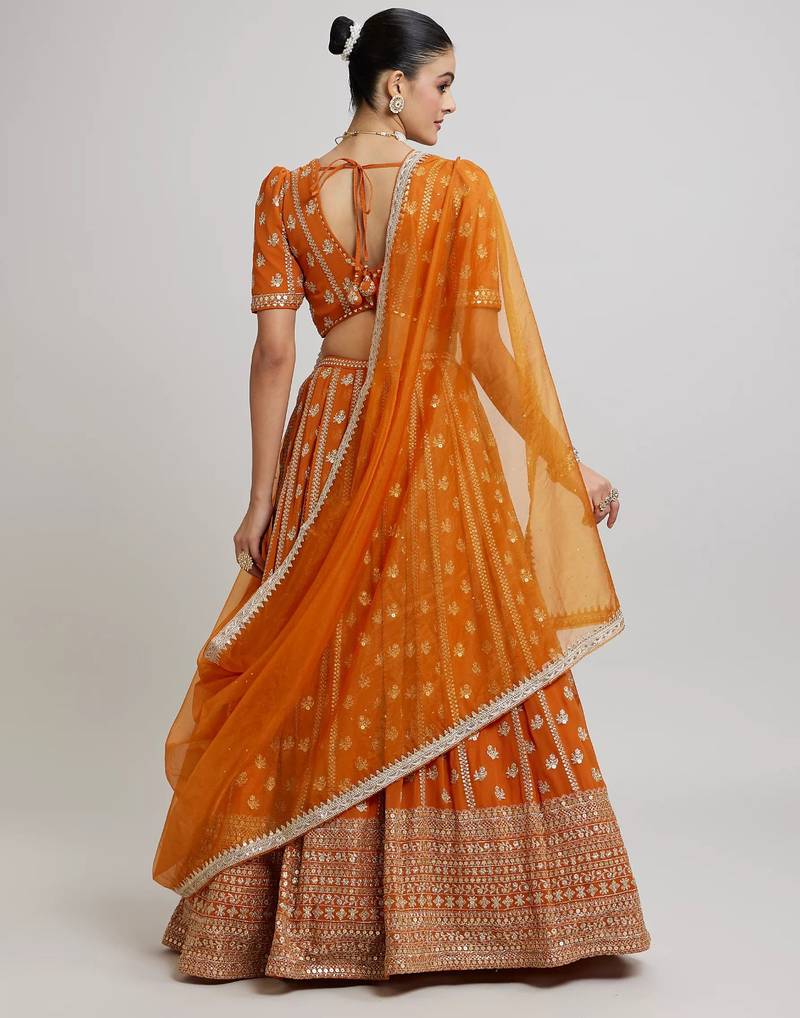 Orange radiance 7mm and 3mm matte sequins with zari embroidered georgette lehenga choli