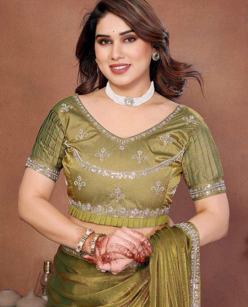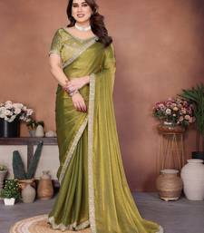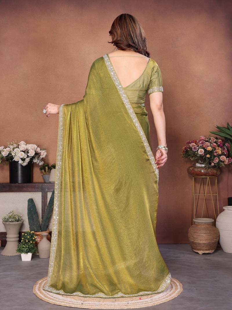 Pleasing mahendi fendy chiffon beads embroidery work lace border saree with fendy chiffon blouse