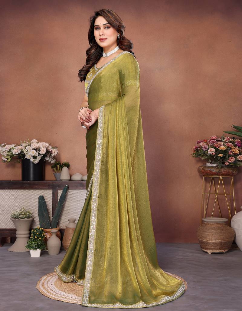 | Product Name | Pleasing Mahendi Fendy Chiffon Beads Embroidery Work Lace Border Saree With Fendy Chiffon Blouse | |