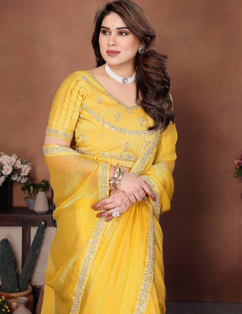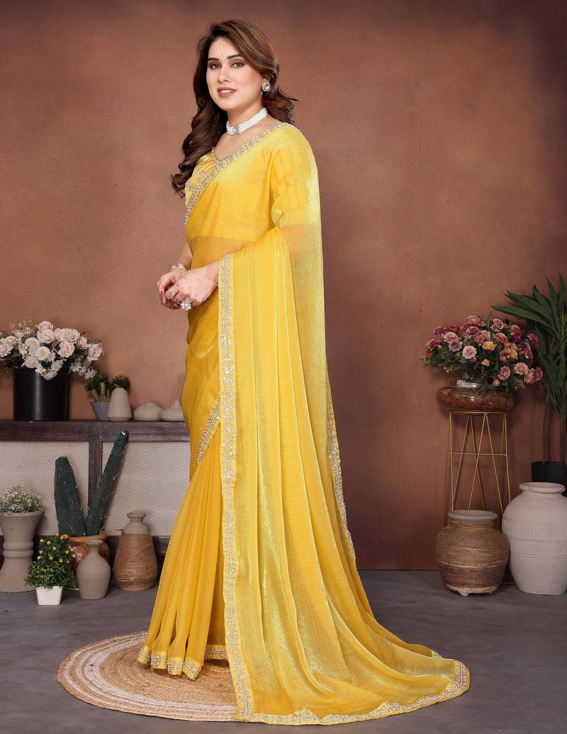 | Product Name | Provocative Yellow Fendy Chiffon Beads Embroidery Work Lace Border Saree With Fendy Chiffon Blouse | |