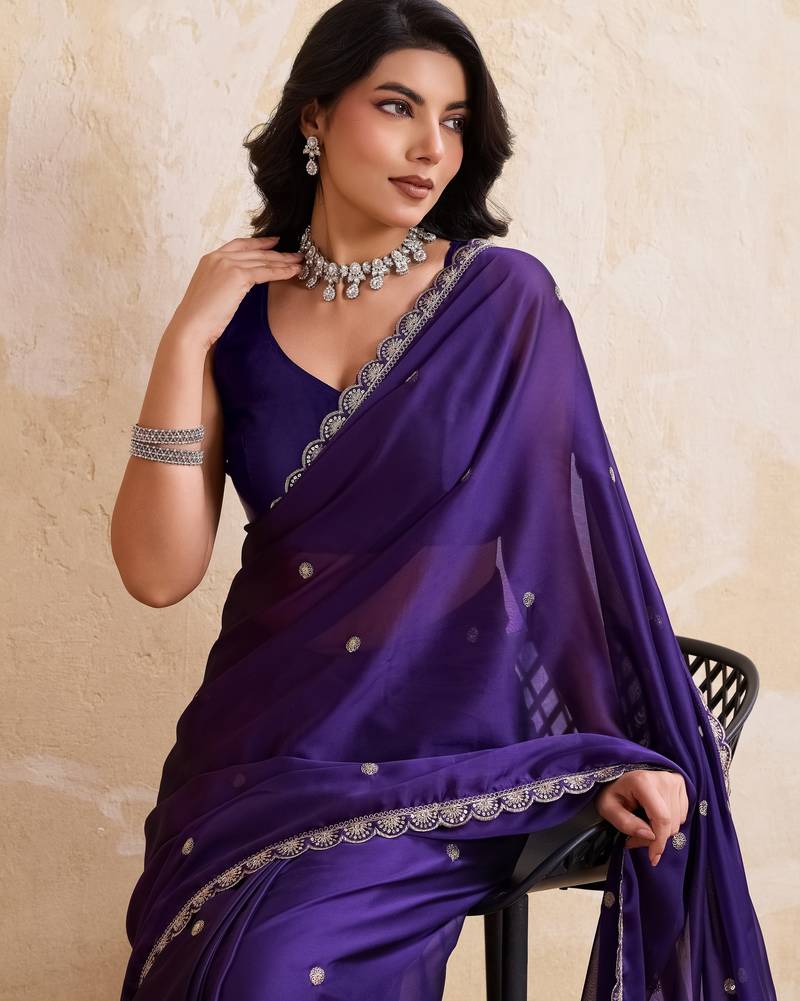 Seductive purple rangoli silk embroidery cutwork work lace border saree with rangoli silk blouse