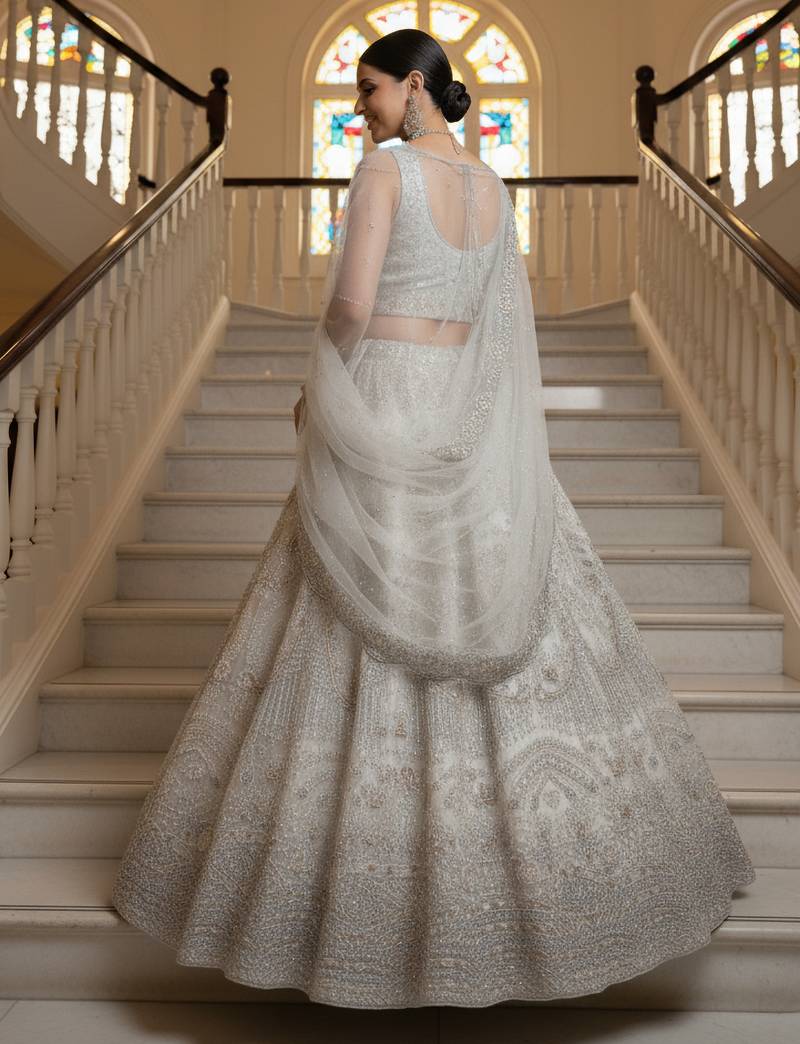Spellbinding White White Pearl Beads, Thread work, Zari and Dori Embroidered, Zircon Diamond Heavy Net Lehenga Choli