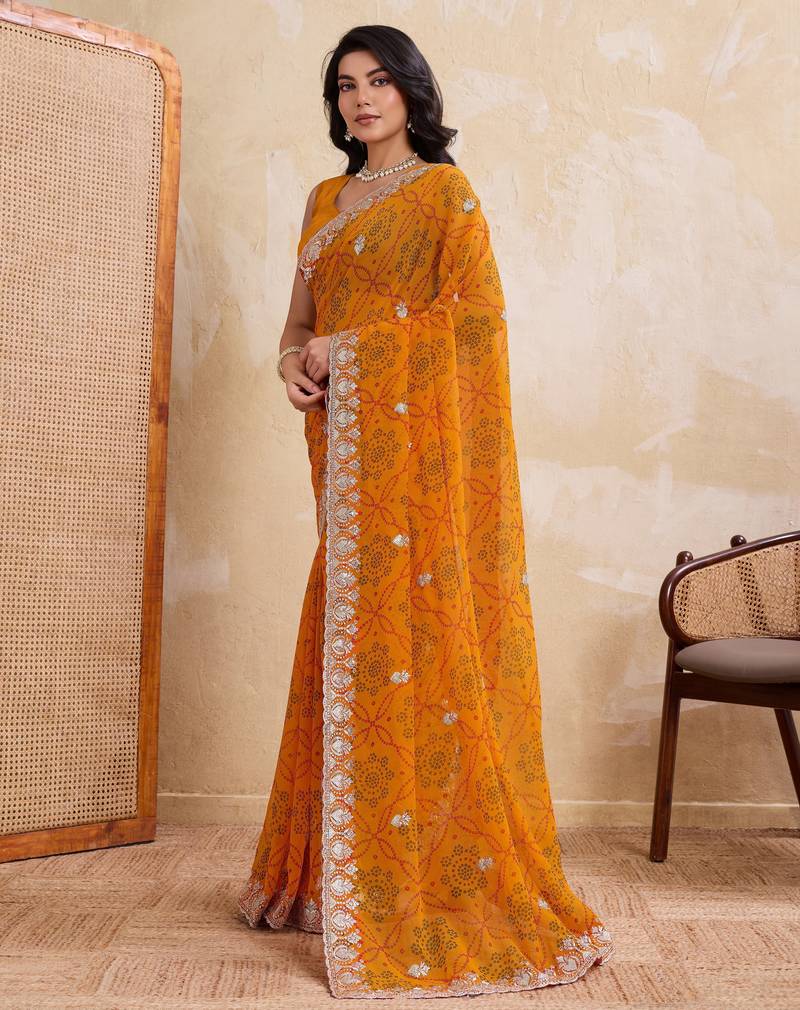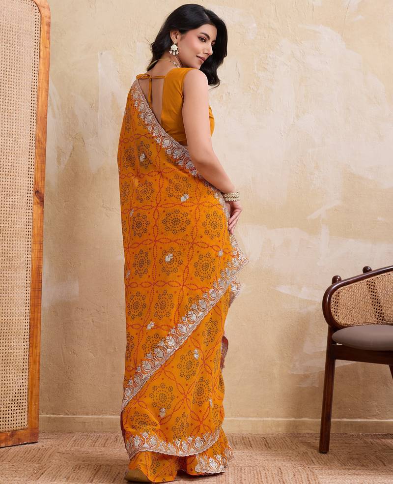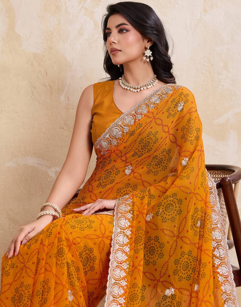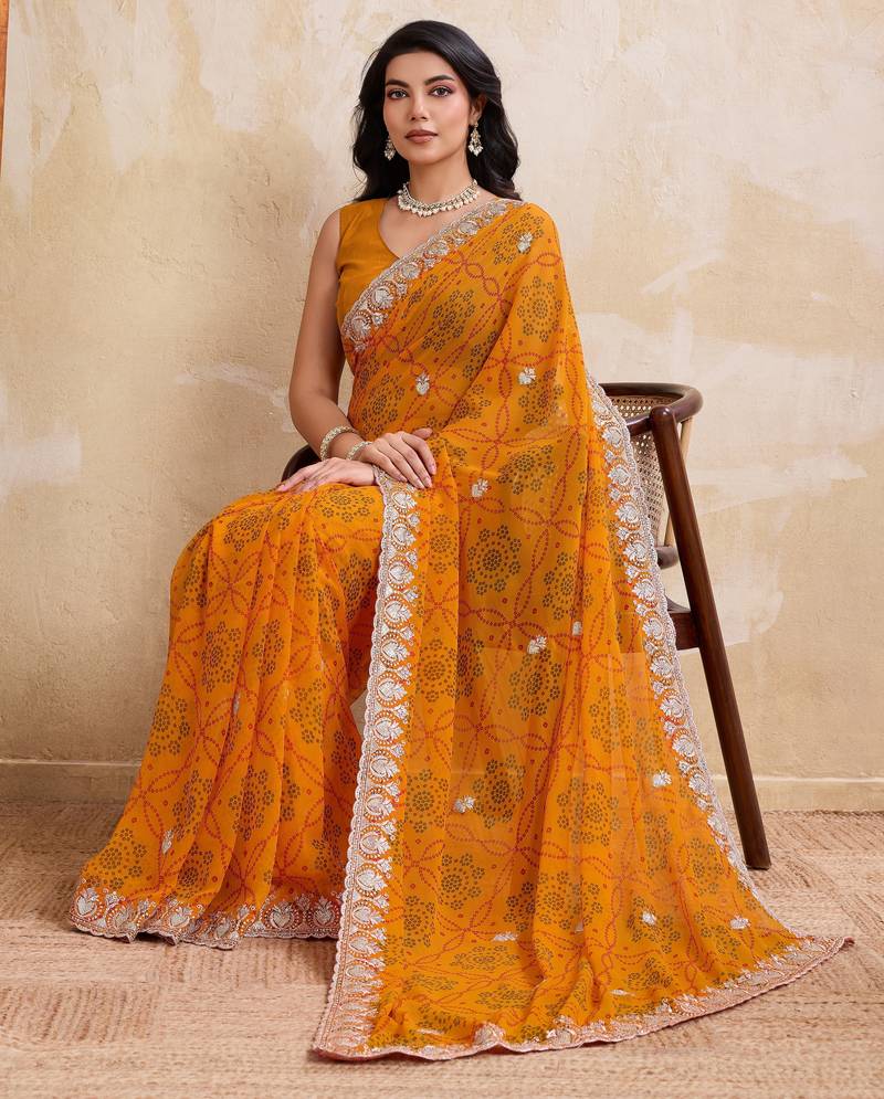 | Product Name | Spellbinding Yellow Georgette Bandhej Print With Cutwork Lace Border Saree With Mono Banglory Silk Blouse | |